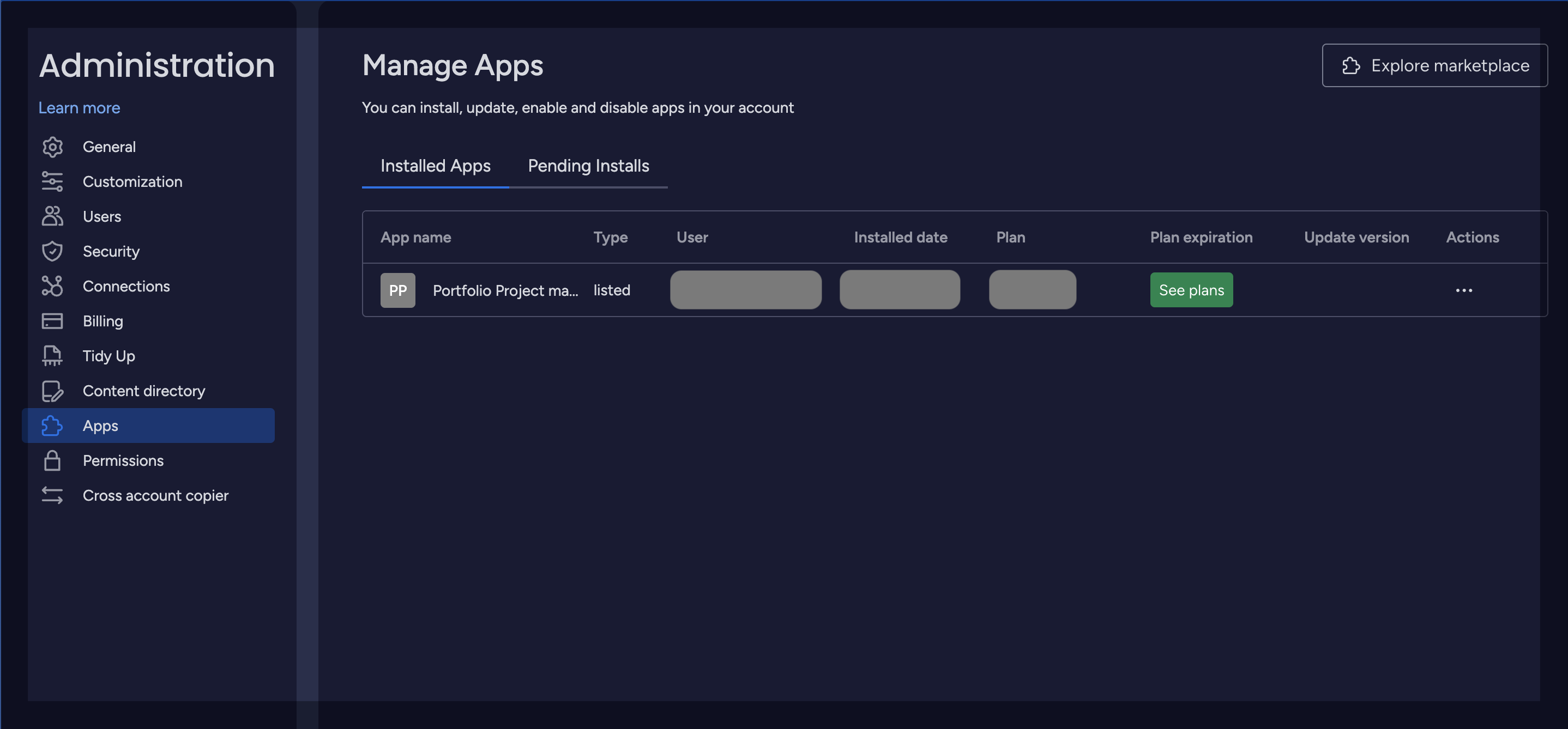In the apps list, select the "Installed Apps" tab find the Portfolio Project management app and simply click on the "Open on board" to initiate its functionality.