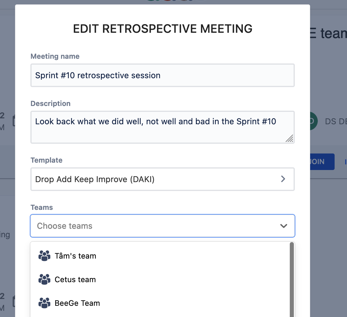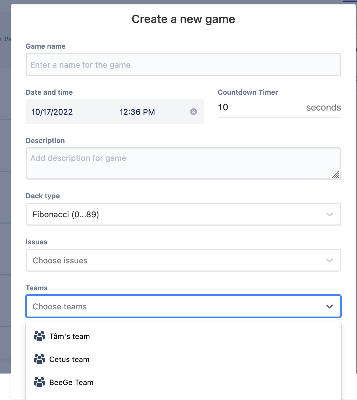 After creating new teams, you can use teams to add members to a Planning Poker game or a Retrospective meeting easily.
