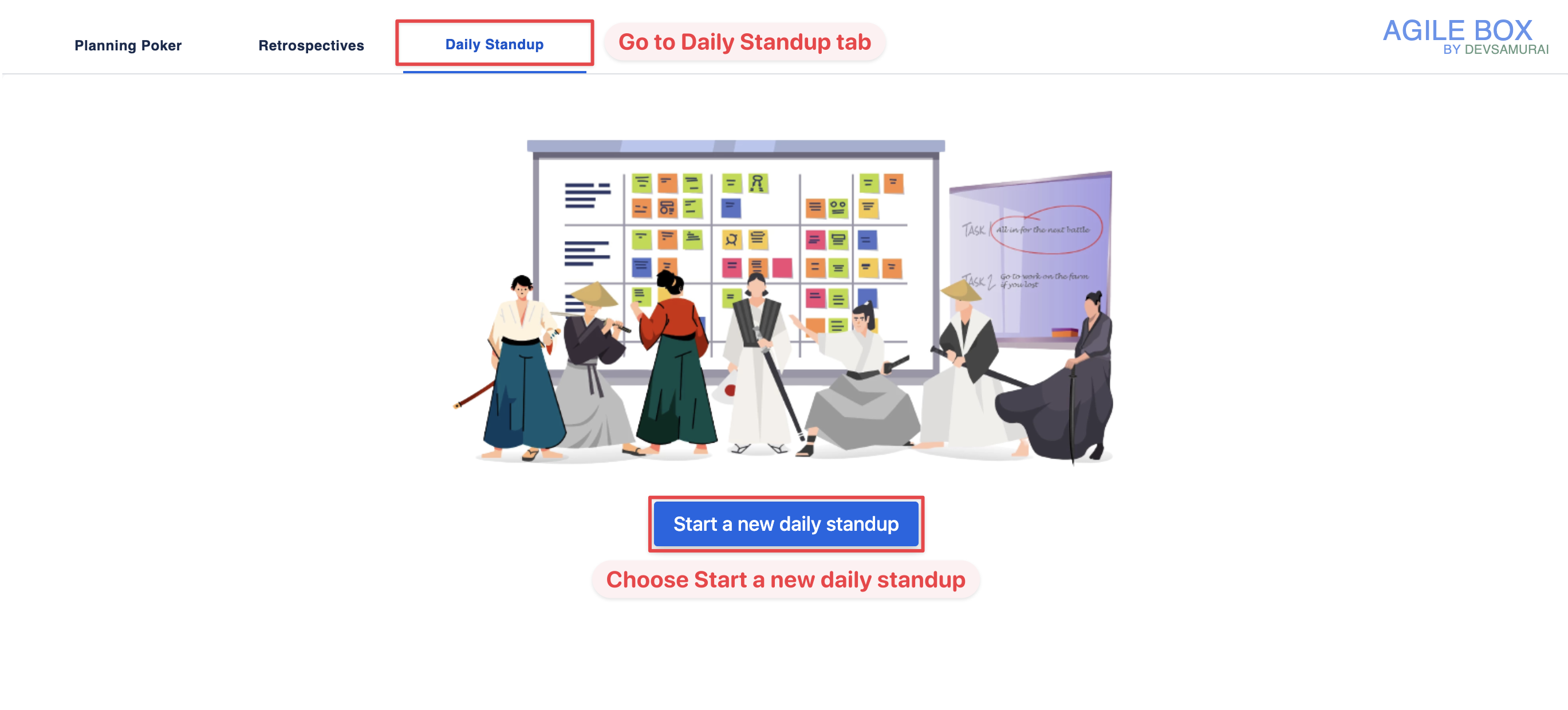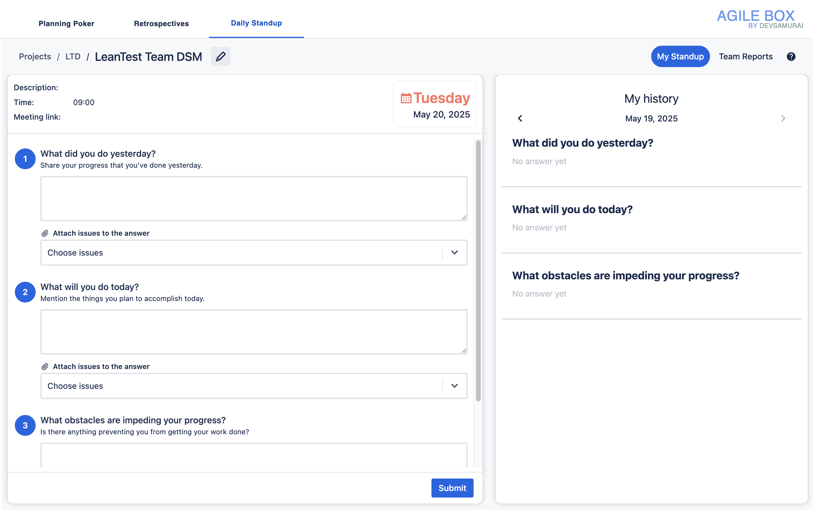 To initiate, go to Project, AgileBox on the sidebar, and find the Daily Standup tab. Then click on the