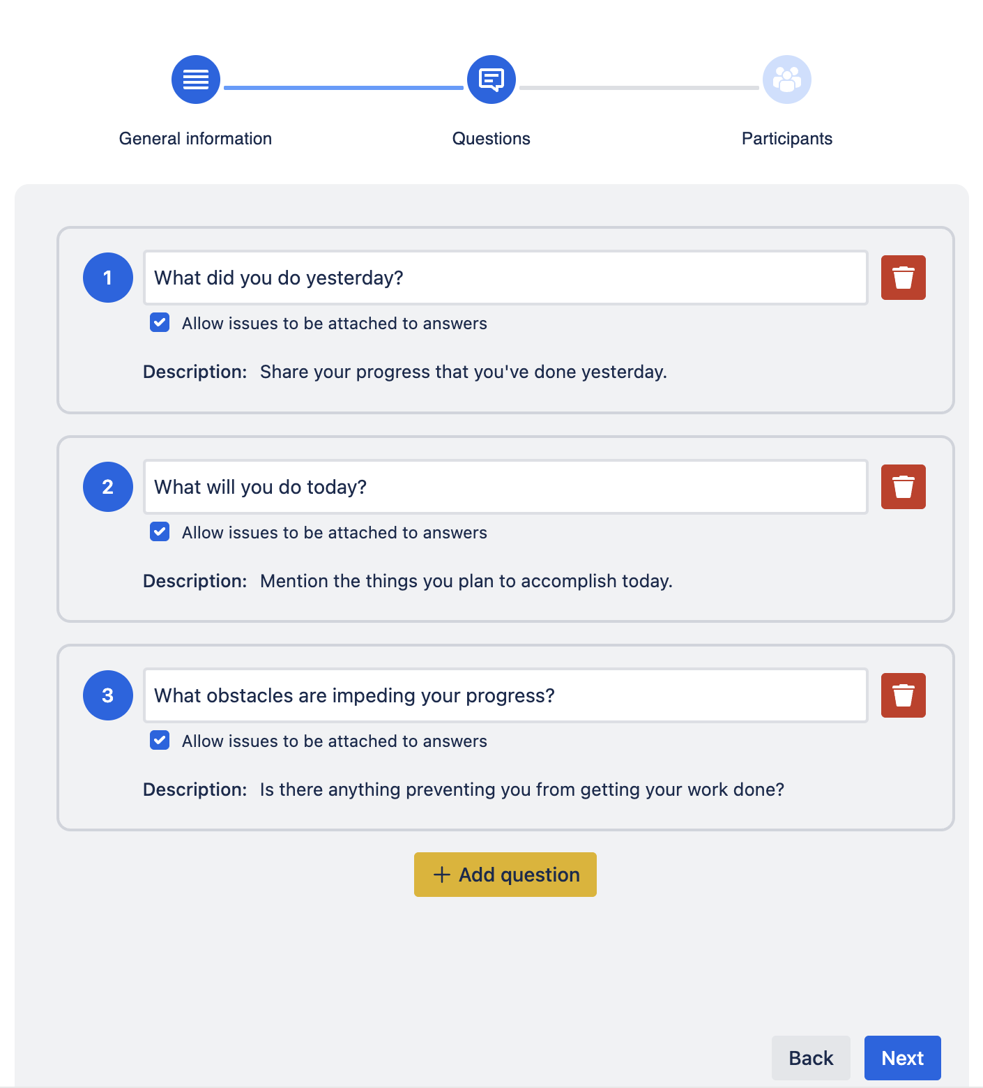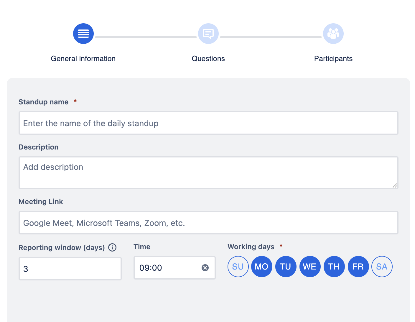 Now, the admins will fill out the form to initiate the standup meeting. There are 3 steps to be completed: