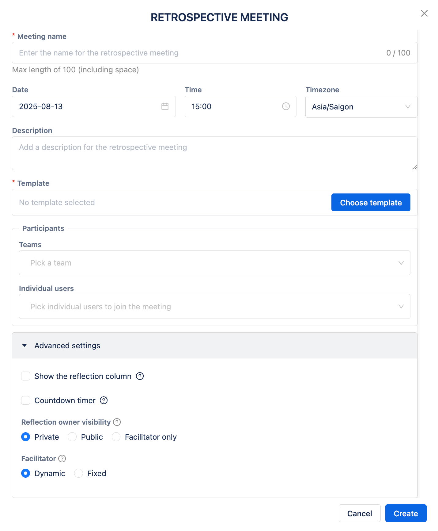 Meeting Name*: Enter the name for your retrospective meeting.