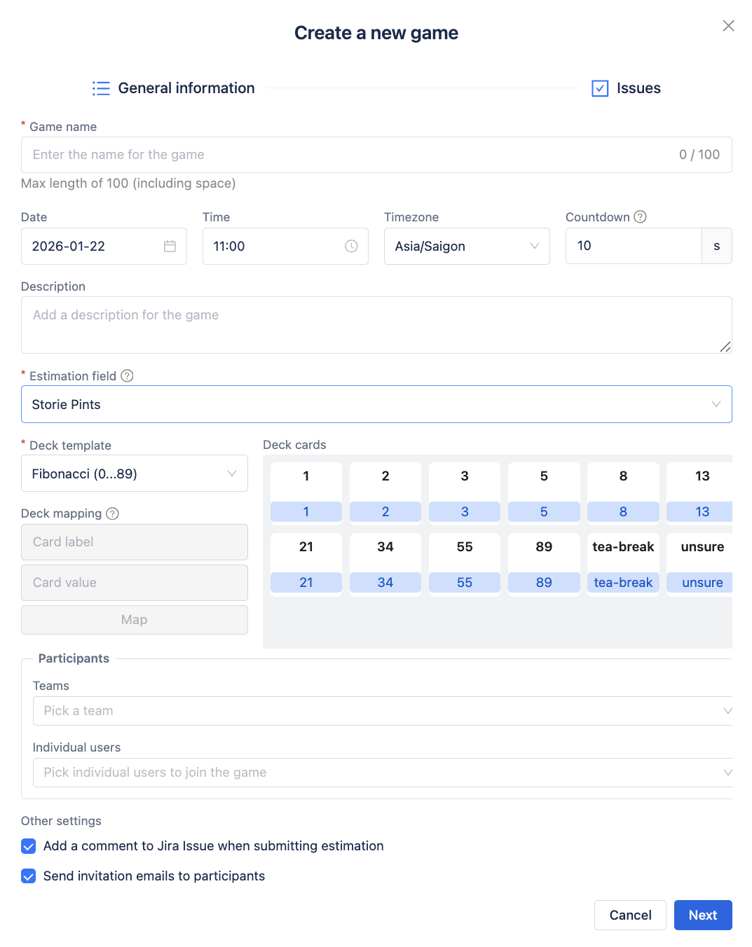 Deck template *: Select the estimation template for your team (Fibonacci, T-Shirt, or Custom decks). See more details here: Estimation methods