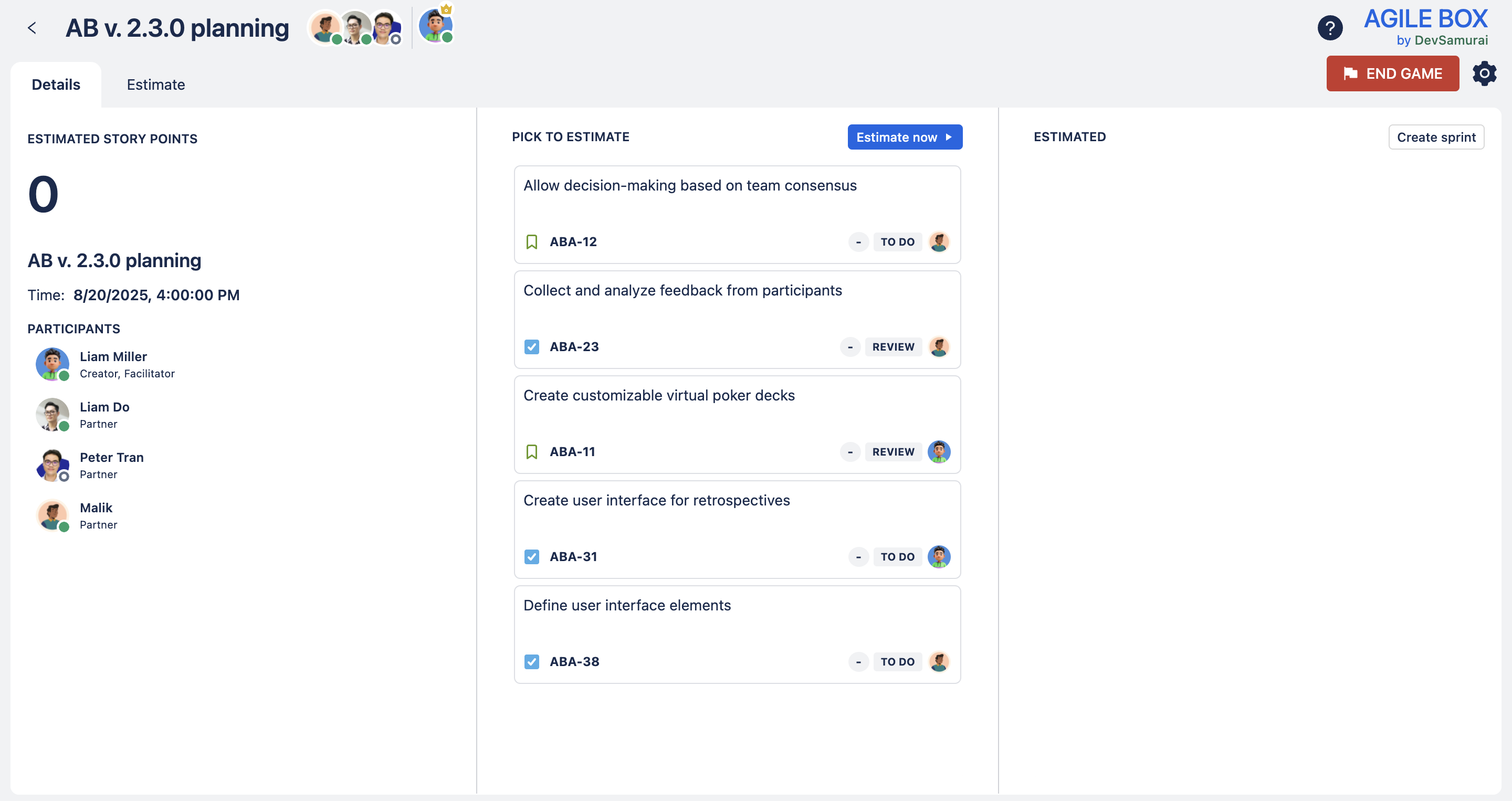 The issue list: the list of issues for estimation of the game. The game facilitator can pick any issue on this list to start estimating.