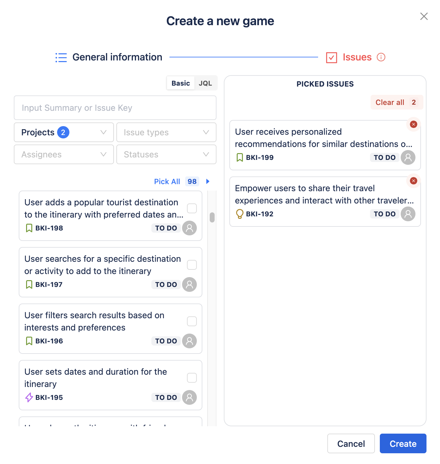 This section allows the game creators to select which issues to estimate in the game from many projects using the filter: