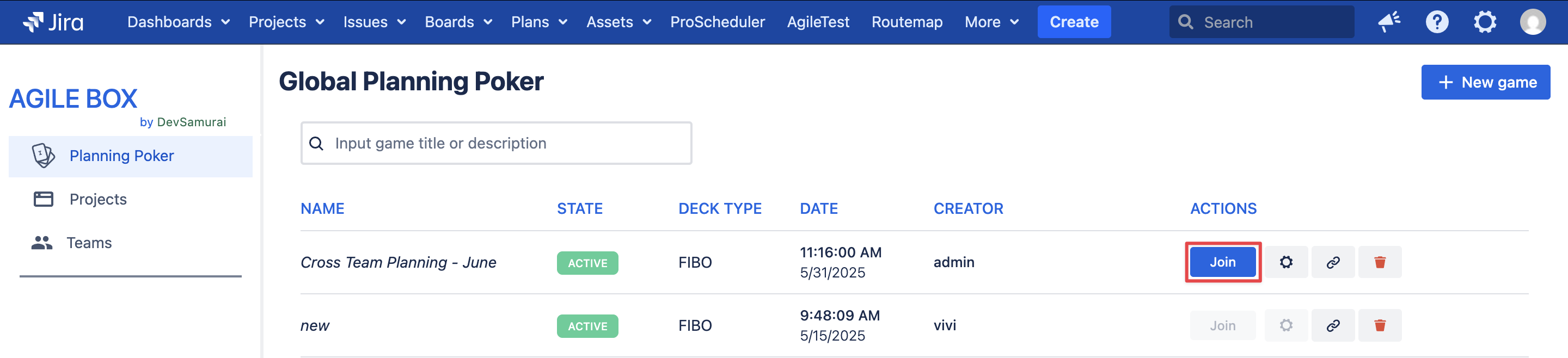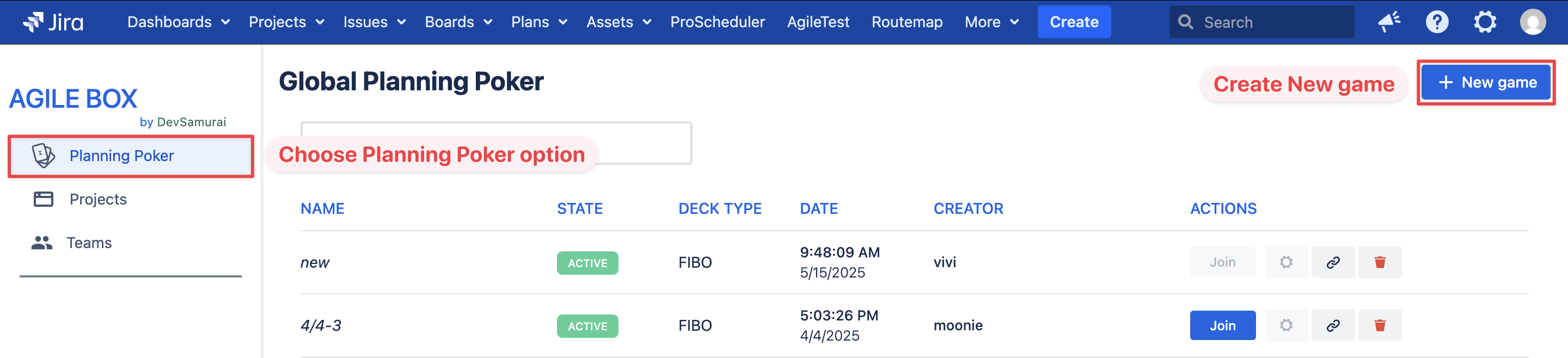 Access AgileBox from your top navigation menu and go to the Planning Poker option. Click on the