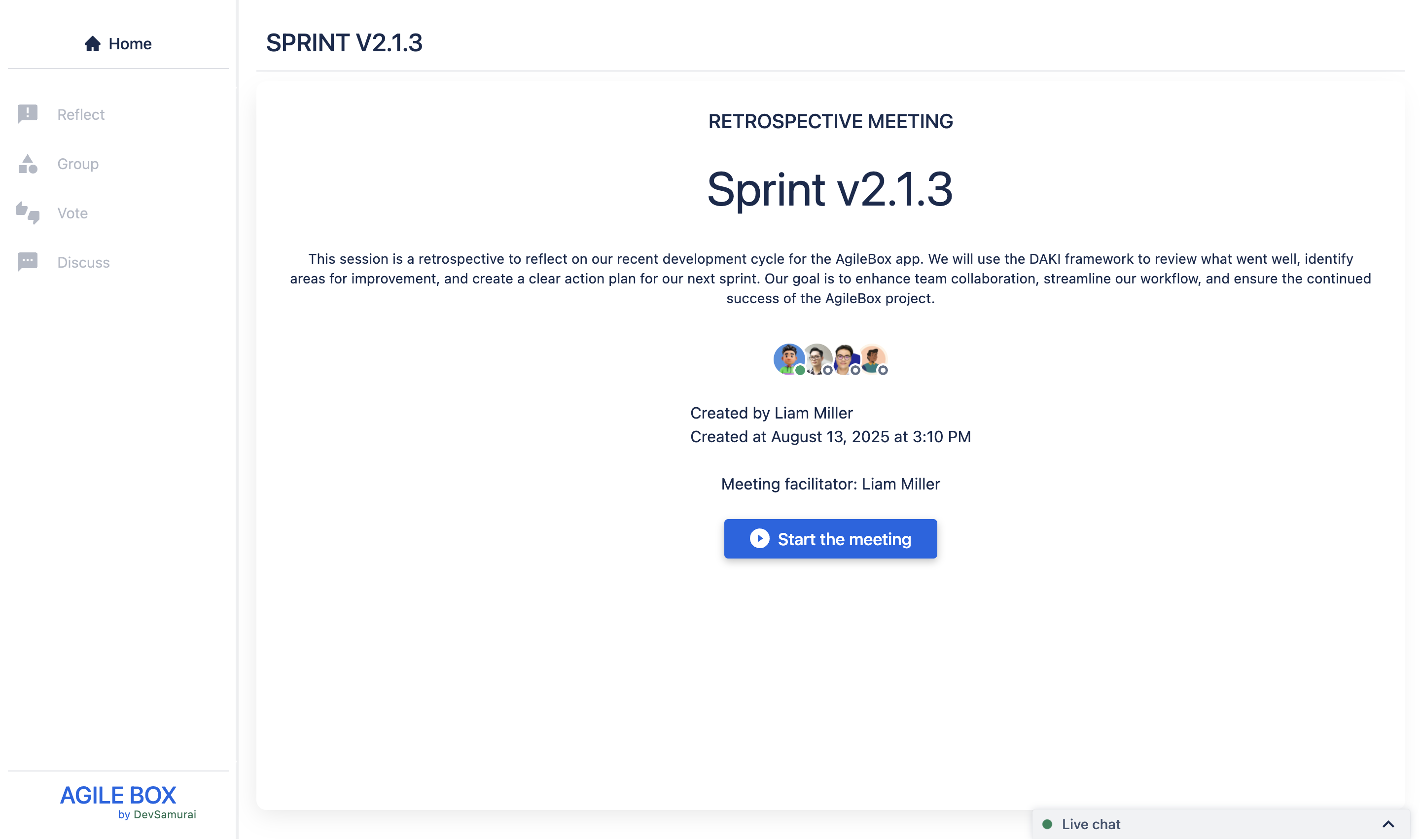 Only the facilitator can start the meeting. Once started, all participants move through 4 stages of the retrospective session together.