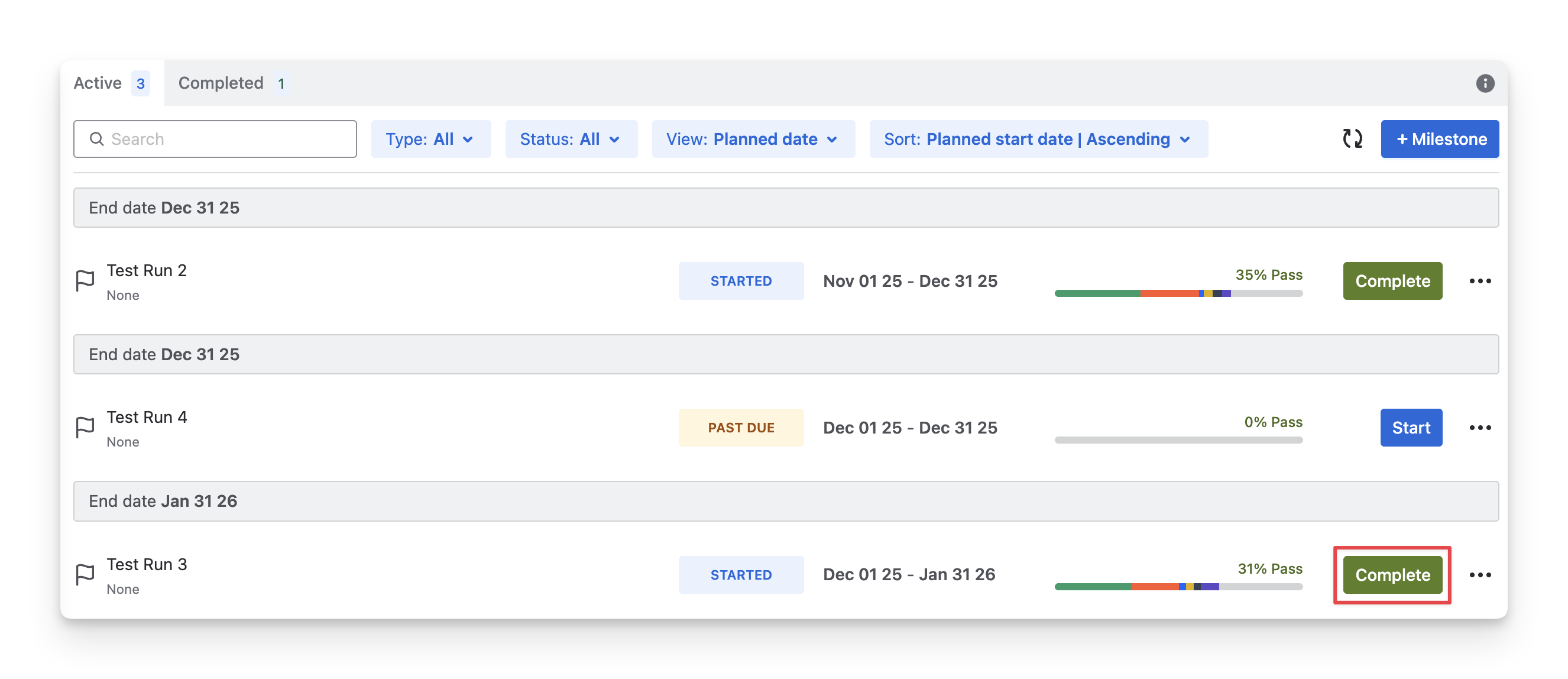Planned Dates: the start and end dates you set when planning a milestone. These dates represent when testing is expected to begin and finish.
