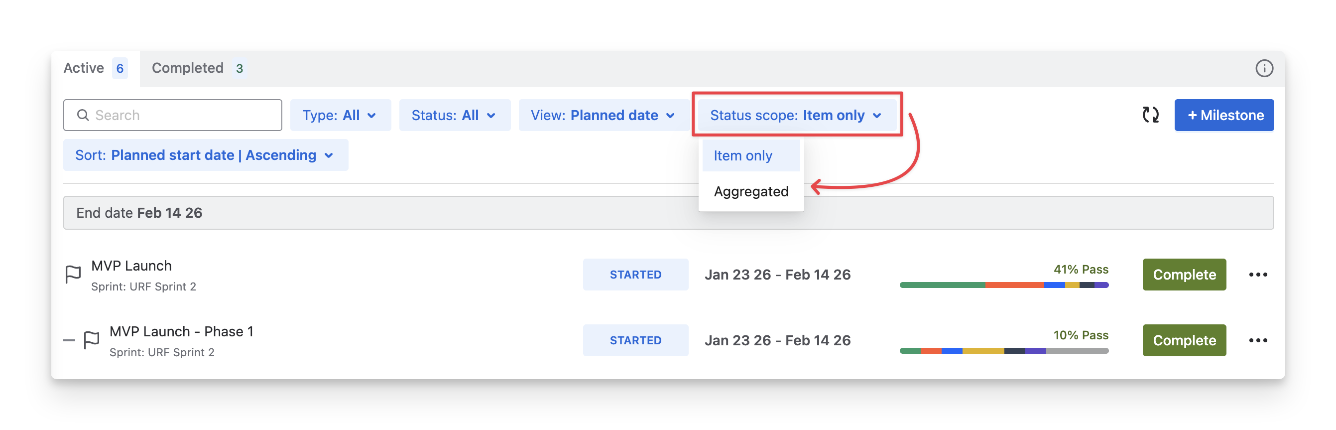 Aggregated: The milestone progress includes results from its sub-milestones, providing a combined progress view.