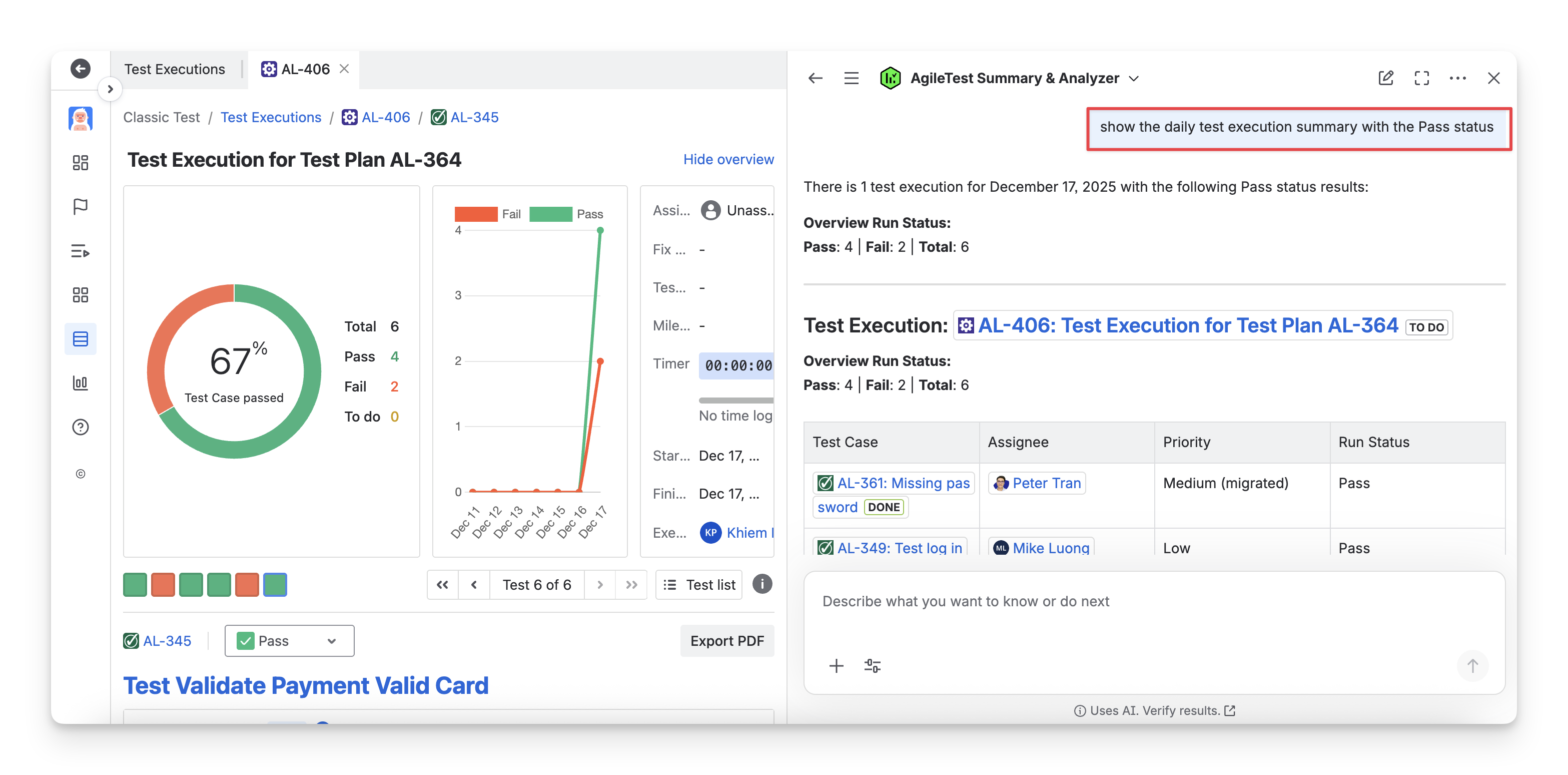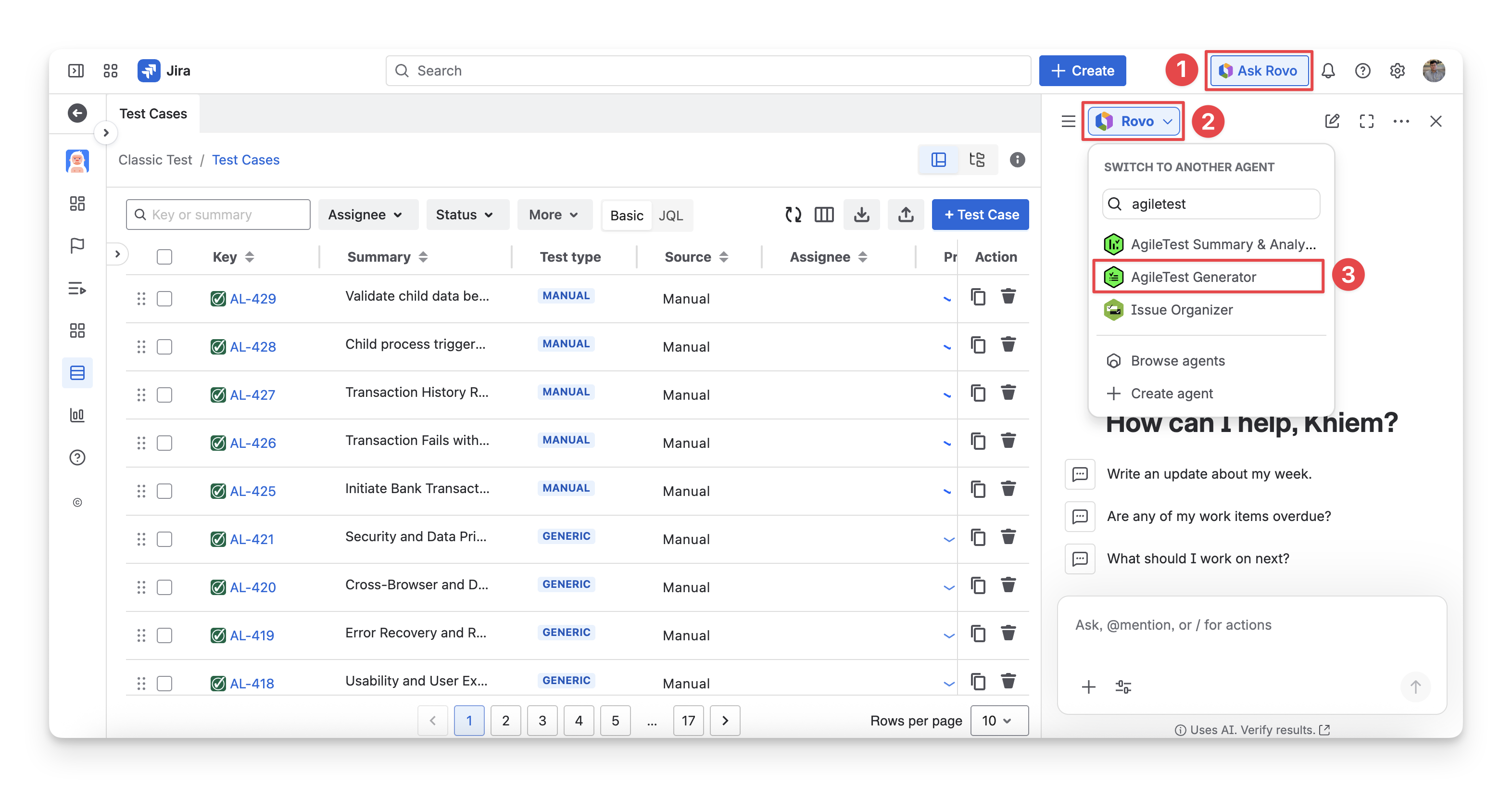 After each answer, AgileTest Agent will ask you a follow-up question if you need to filter the answer based on some output criteria, such as assignee, priority, status, etc. For each type of question you ask the agent, the result table format will be different.