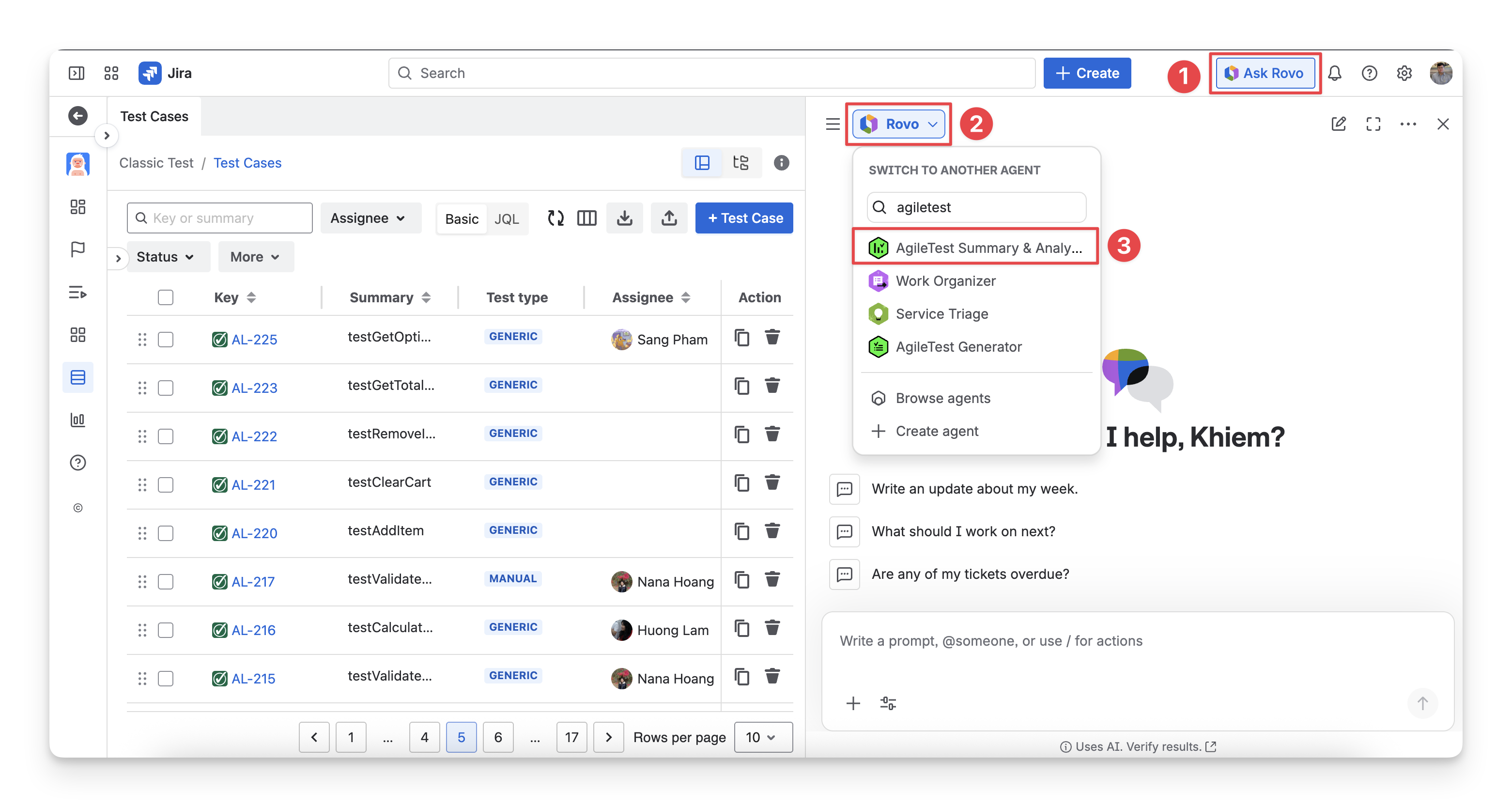 After each answer, AgileTest Agent will ask you a follow-up question if you need to filter the answer based on some output criteria, such as assignee, priority, status, etc. For each type of question you ask the agent, the result table format will be different.