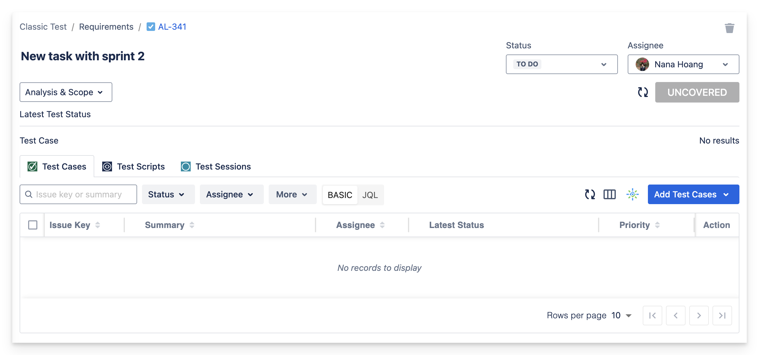 If no test case or test script is added to the requirement, the requirement’s run status will result as UNCOVERED.