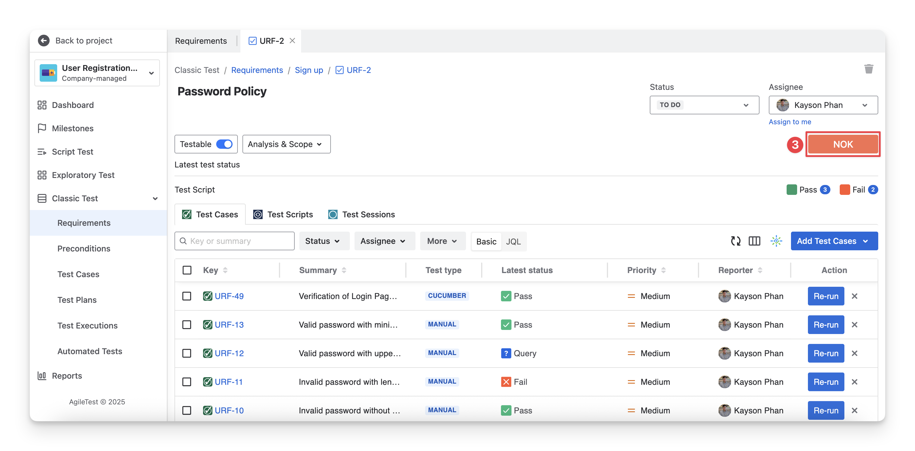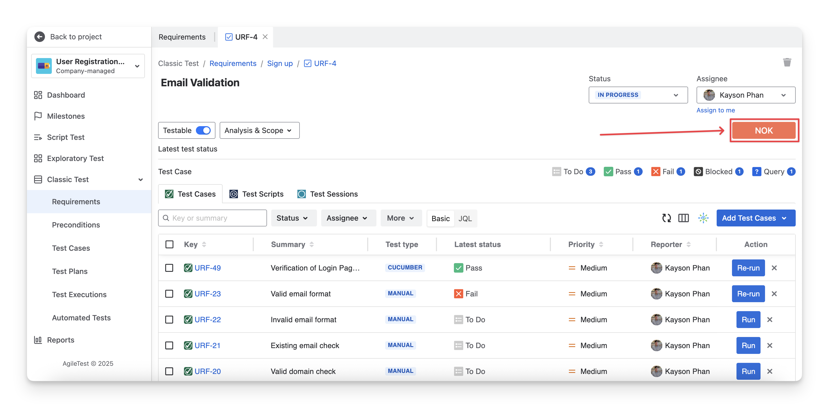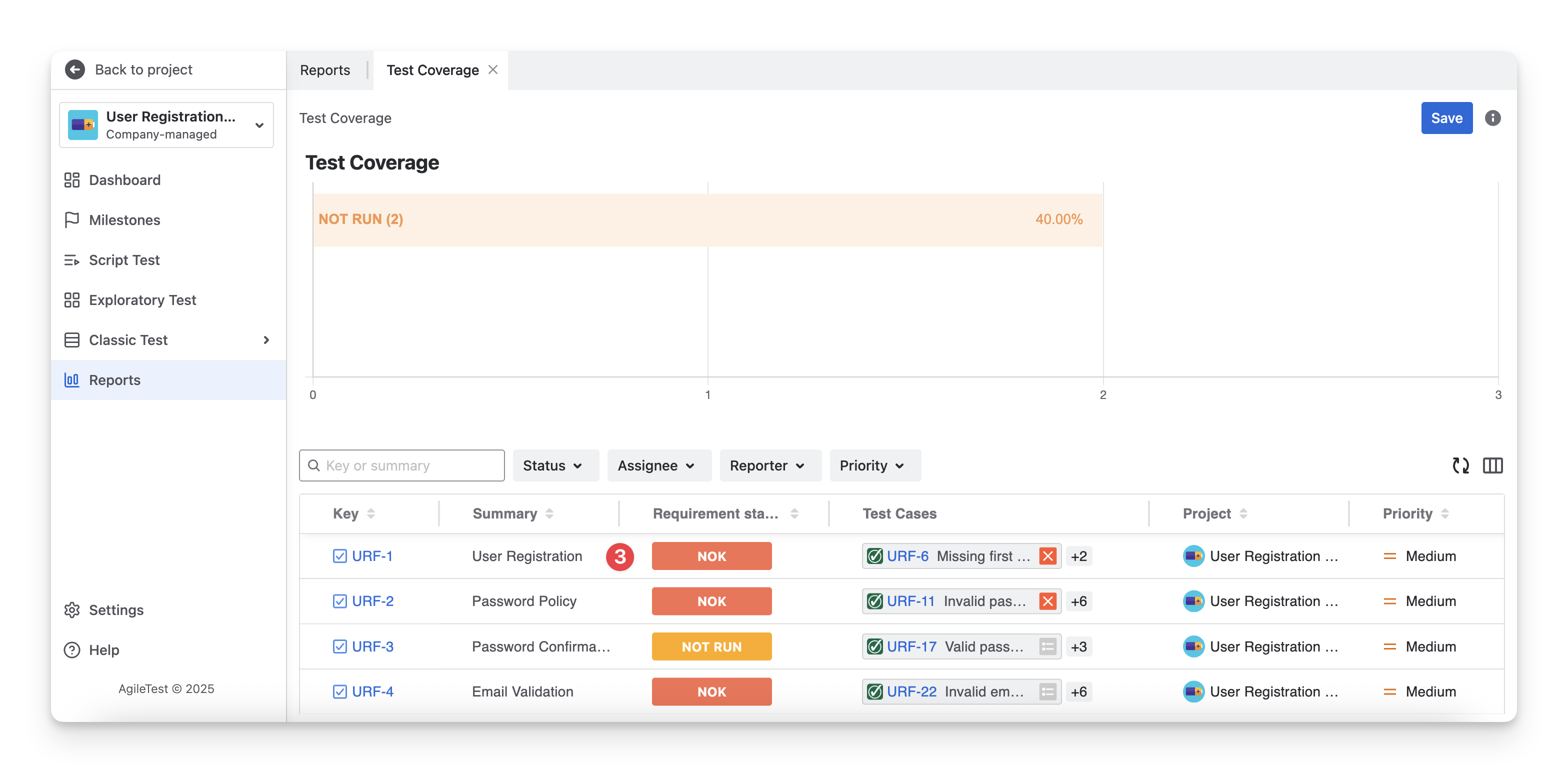 There are 6 types of Requirement Status: NOK; NOT RUN; UNKNOWN; OK; UNCOVERED; COVERED. These statuses allow testers to quickly see which requirements have been fully tested, which are still in progress, and which may need additional testing.