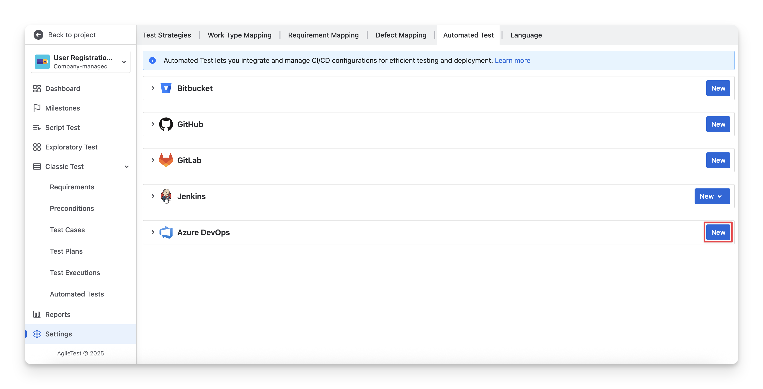 This section explains how to configure Azure DevOps in AgileTest to trigger CI/CD pipelines remotely. Once configured, AgileTest can connect to your Azure DevOps repository and allow QA teams to run automated tests directly from a Test Execution issue without switching to Azure DevOps.