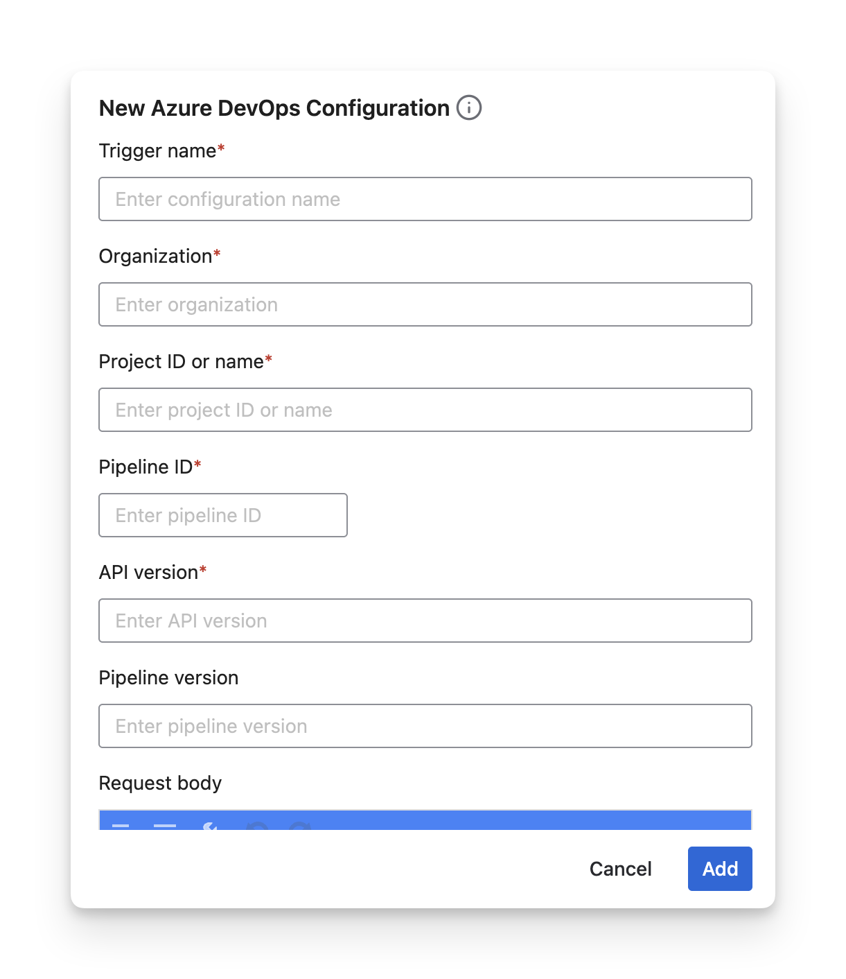Firstly, click the New Azure DevOps Configuration button to reveal the configuration dialog.