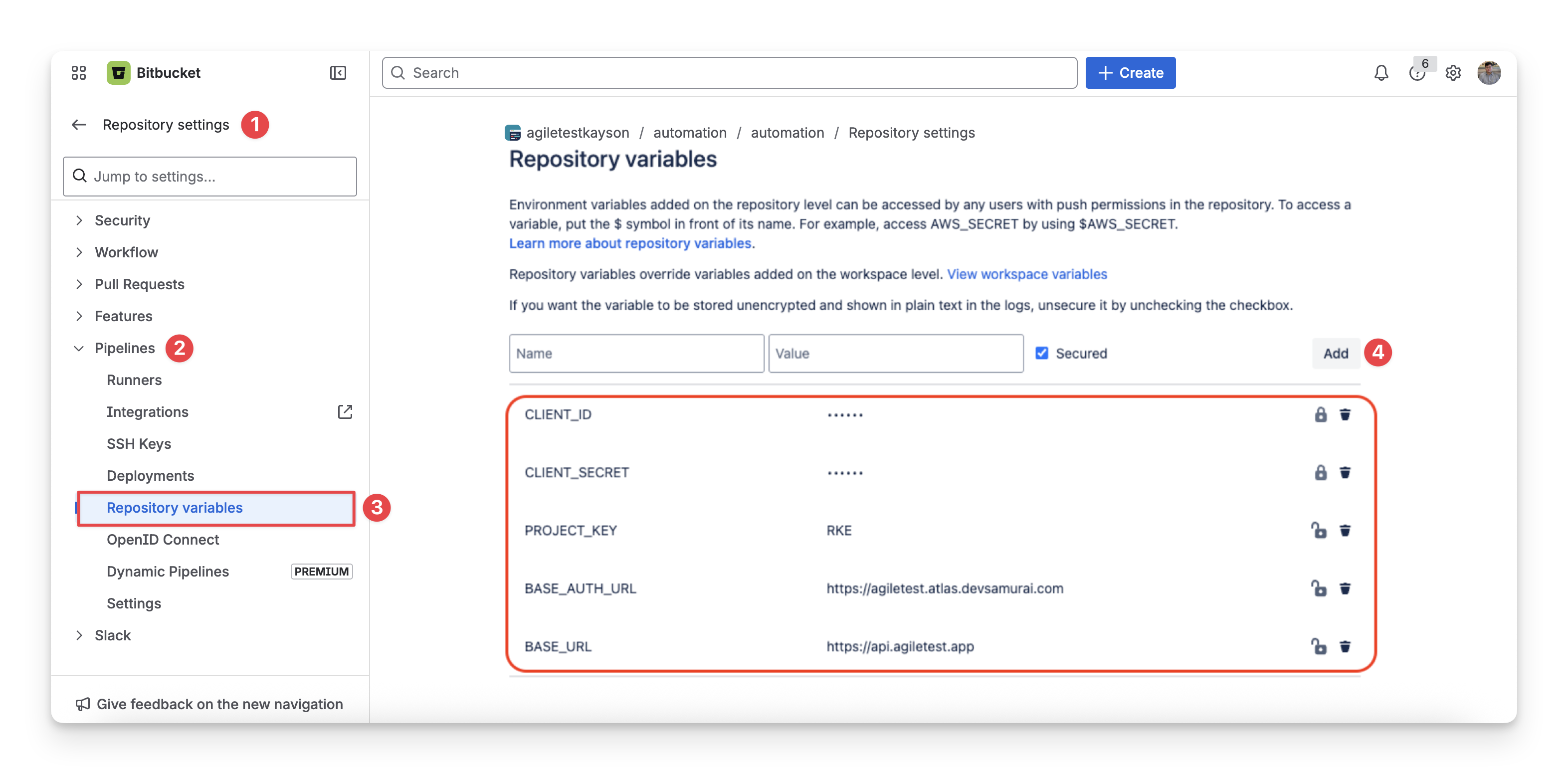 When you integrate AgileTest with Bitbucket, you need to securely store certain authentication details, such as your Client ID and Client Secret. By doing it, you ensure that sensitive data is kept secure and is not exposed in your code or logs, reuse variables in different places, etc. These credentials are also required for AgileTest to authenticate and communicate with Bitbucket in the pipeline.