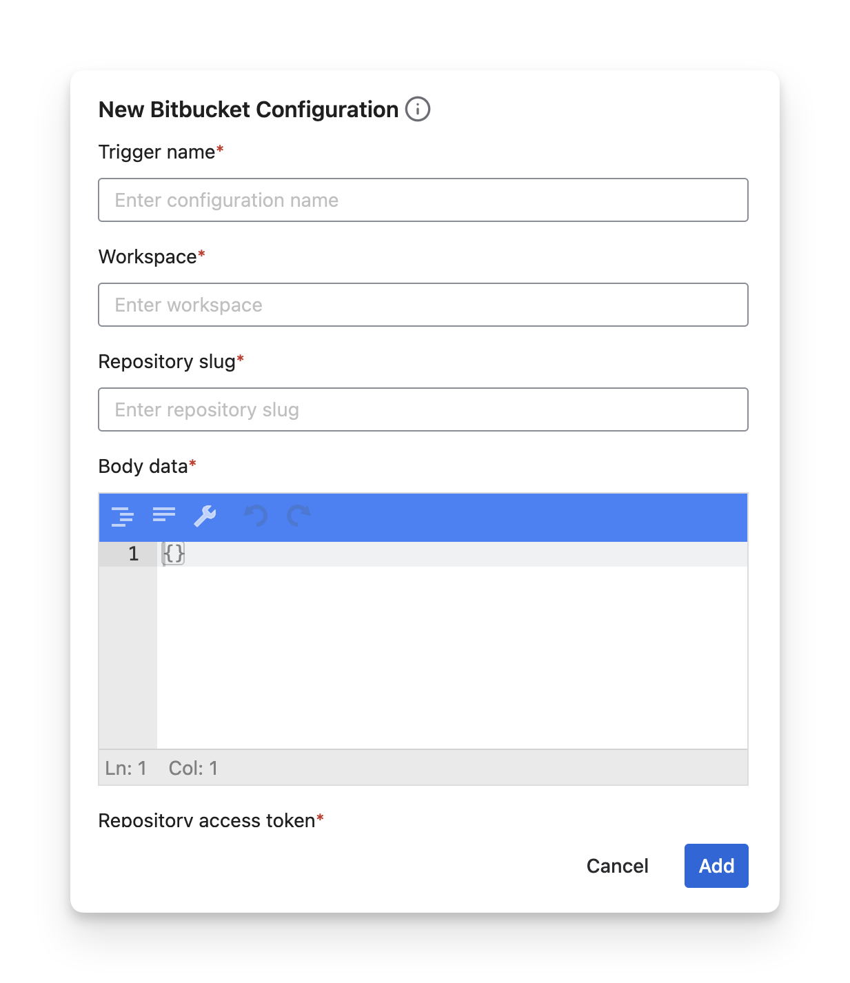 Repository Access Token: the access token of the current repository. To get one, please refer to this document from Jira Create a Repository Access Token.