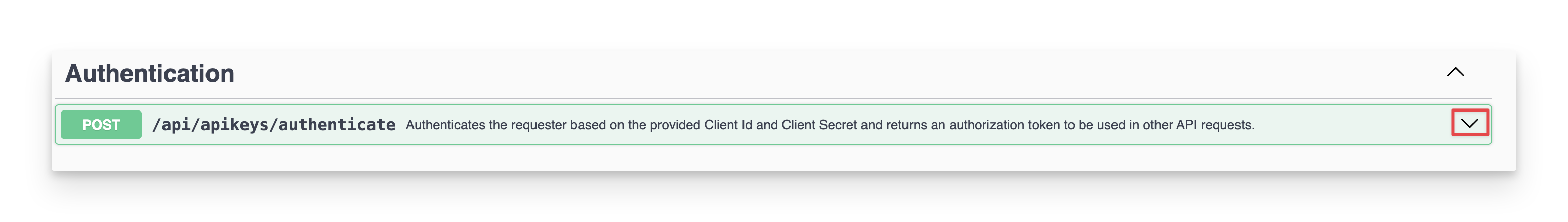 Navigate to the Authentication section of the API Documentation and click the 🔽 button.
