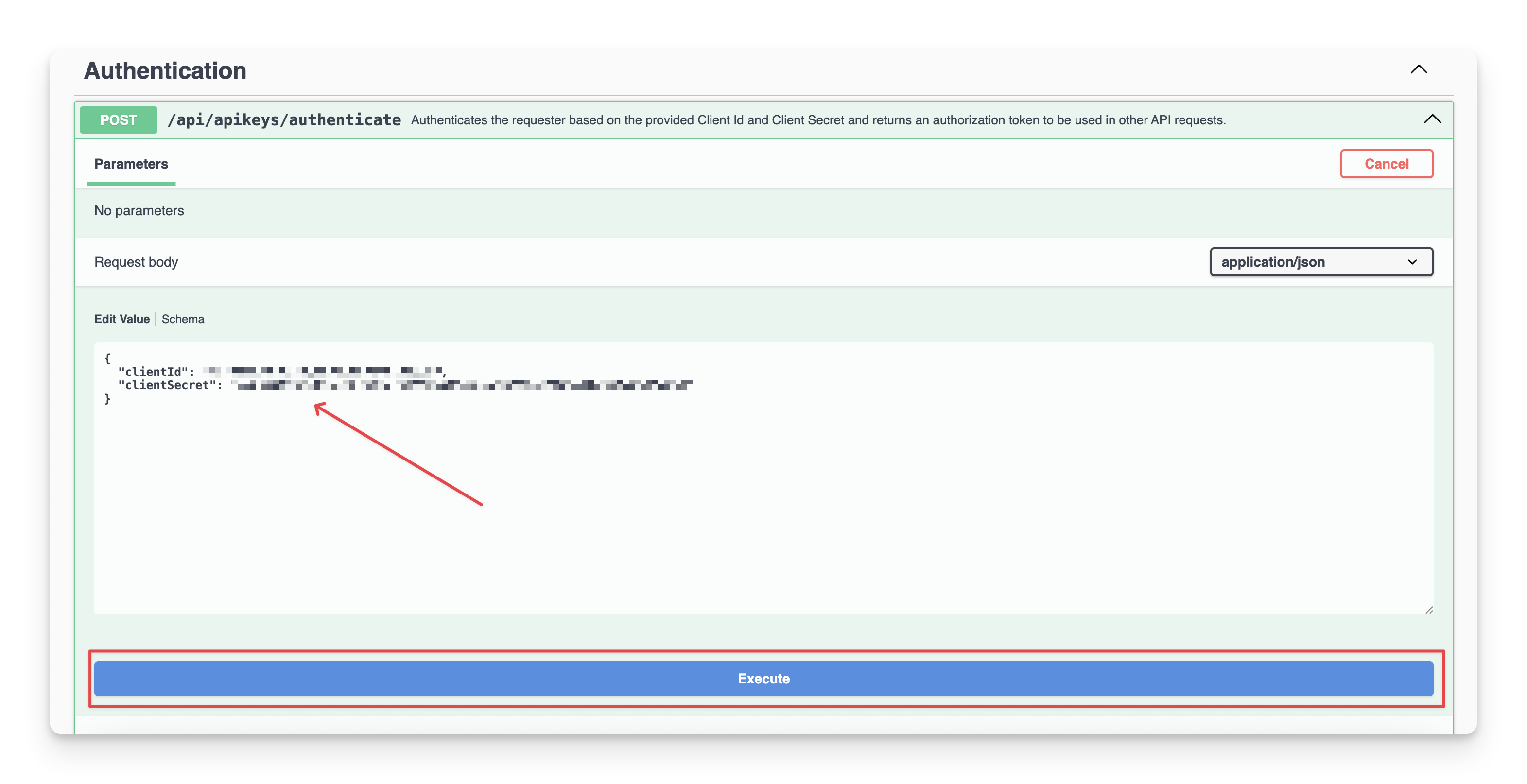 Paste your copied Client ID and Client Secret in the Edit Value space. Then, click the “Execute” button.
