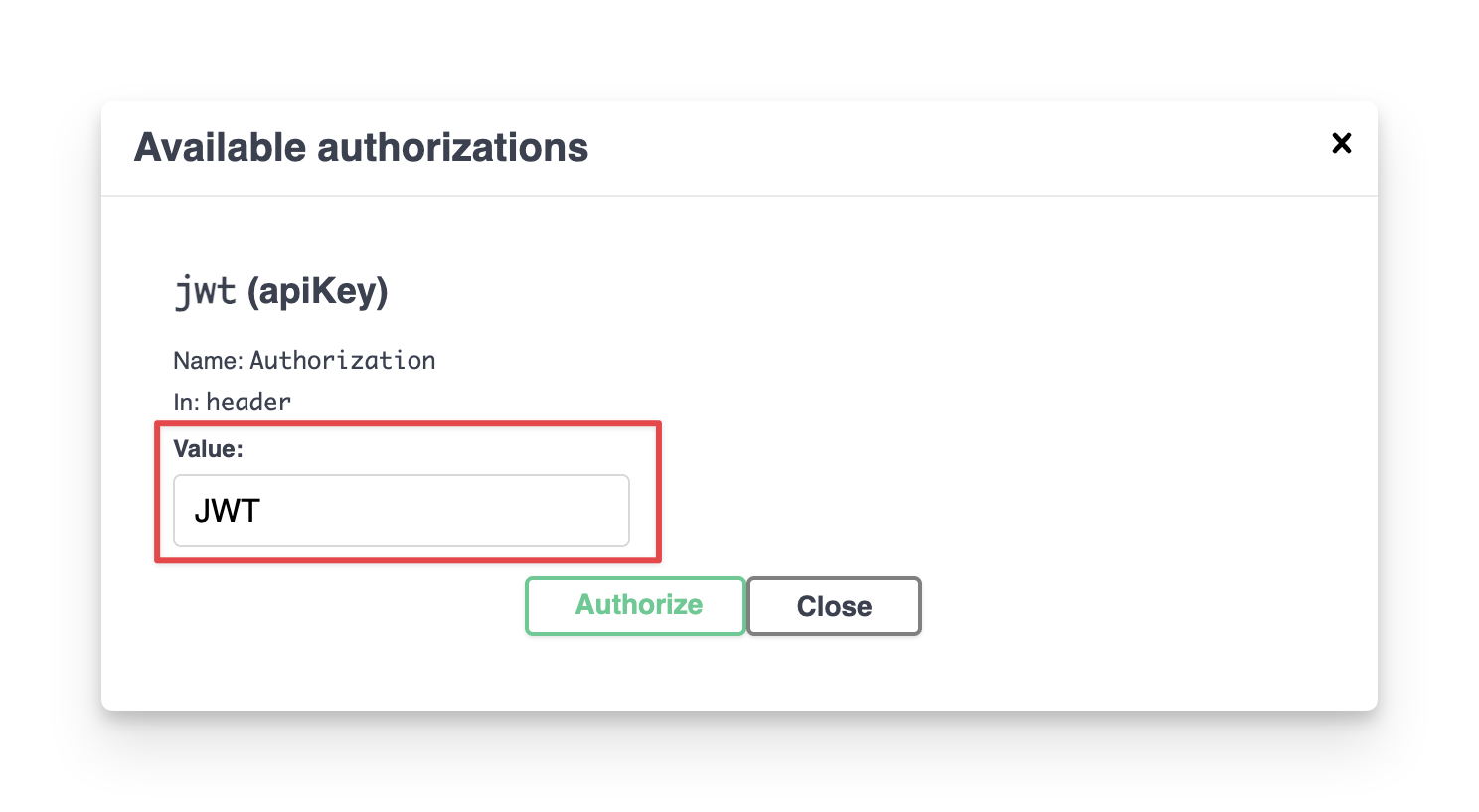 Prepend the token with "JWT " (including a space after JWT) to activate its functionality properly. Click Authorize to finish.