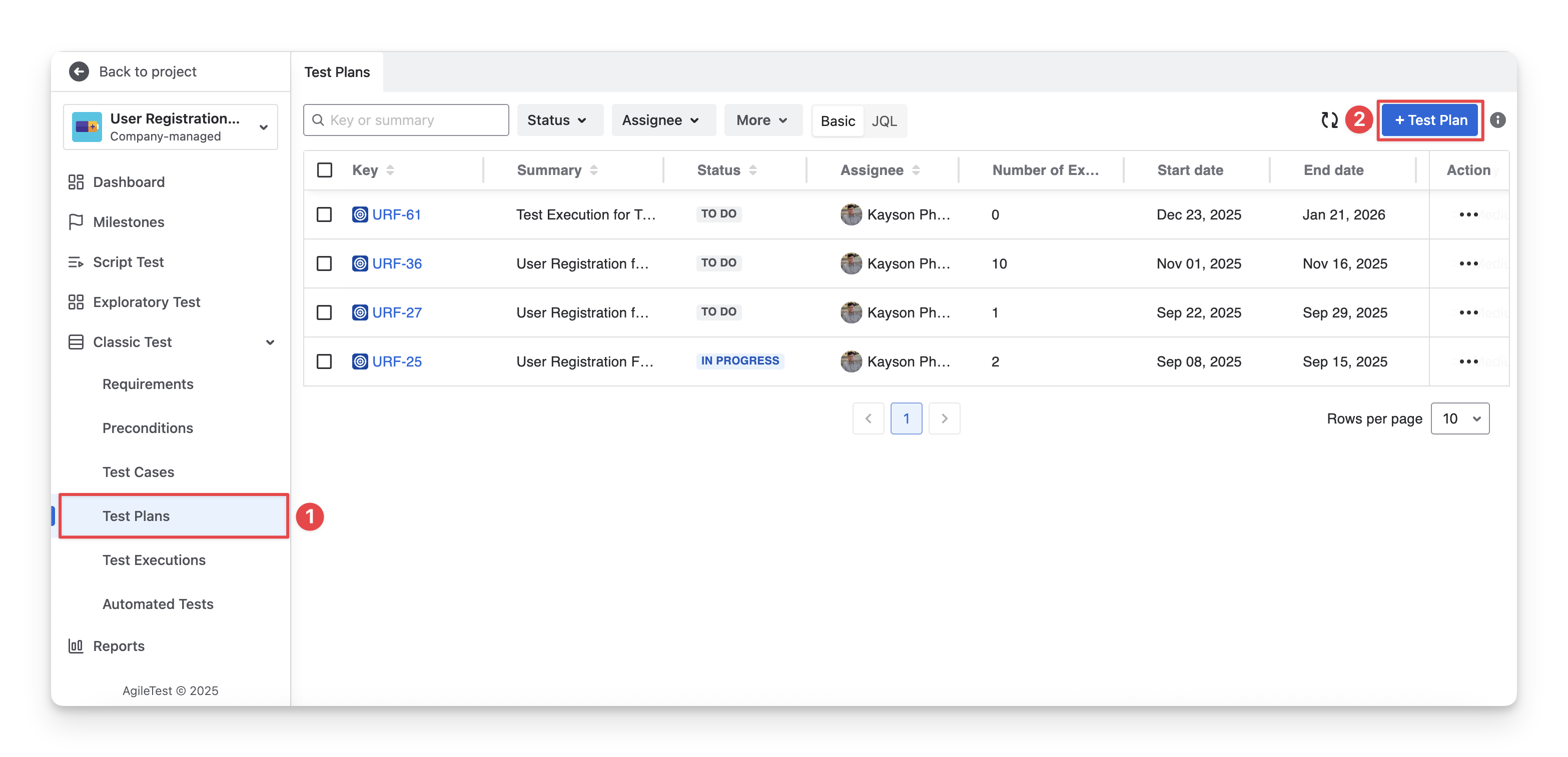 Click on the “+ Test Plan” button.