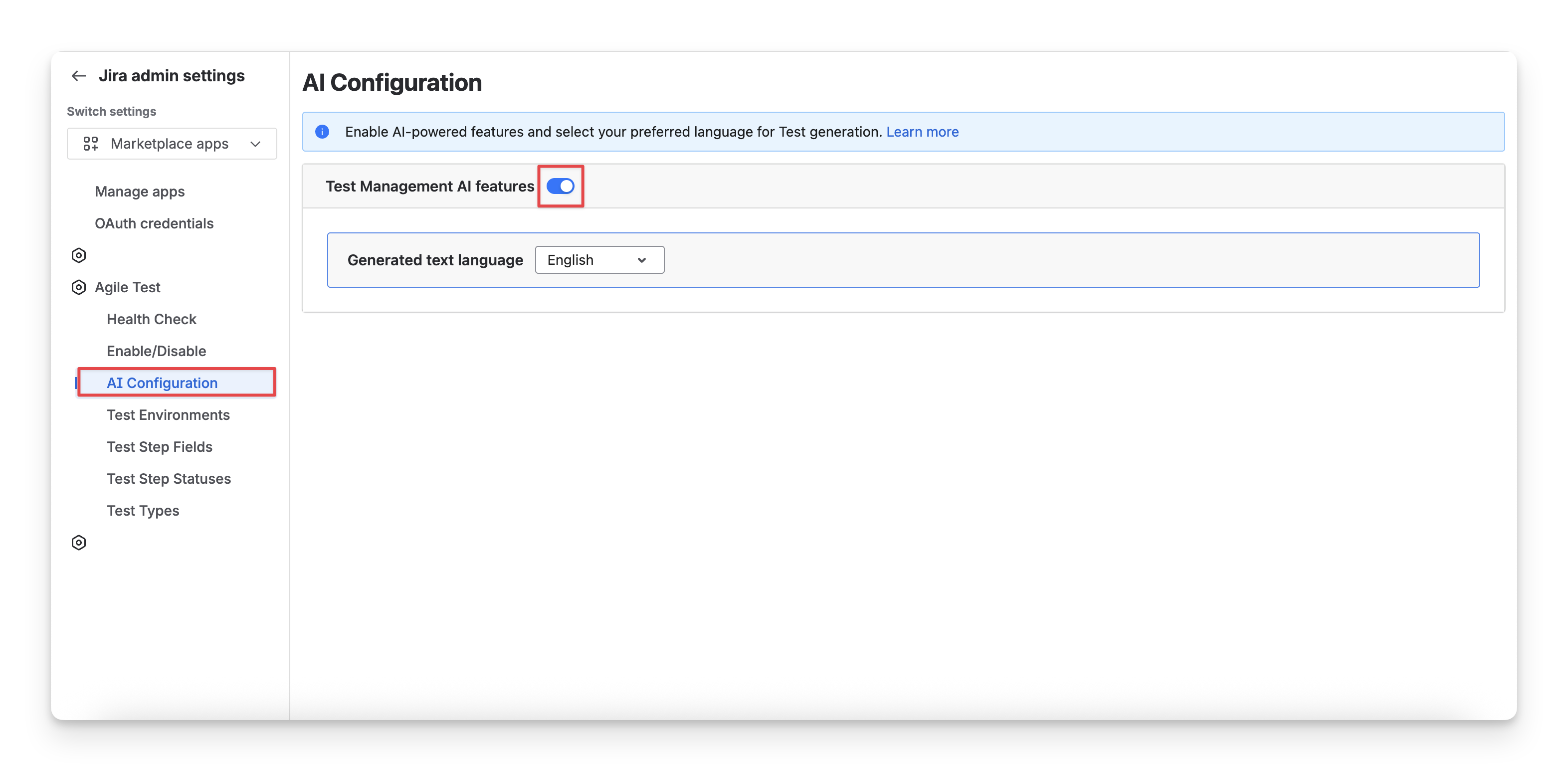 AI features are enabled in the Jira admin settings. To do this, go to ⚙️ → Apps → Agile Test → AI Configuration.