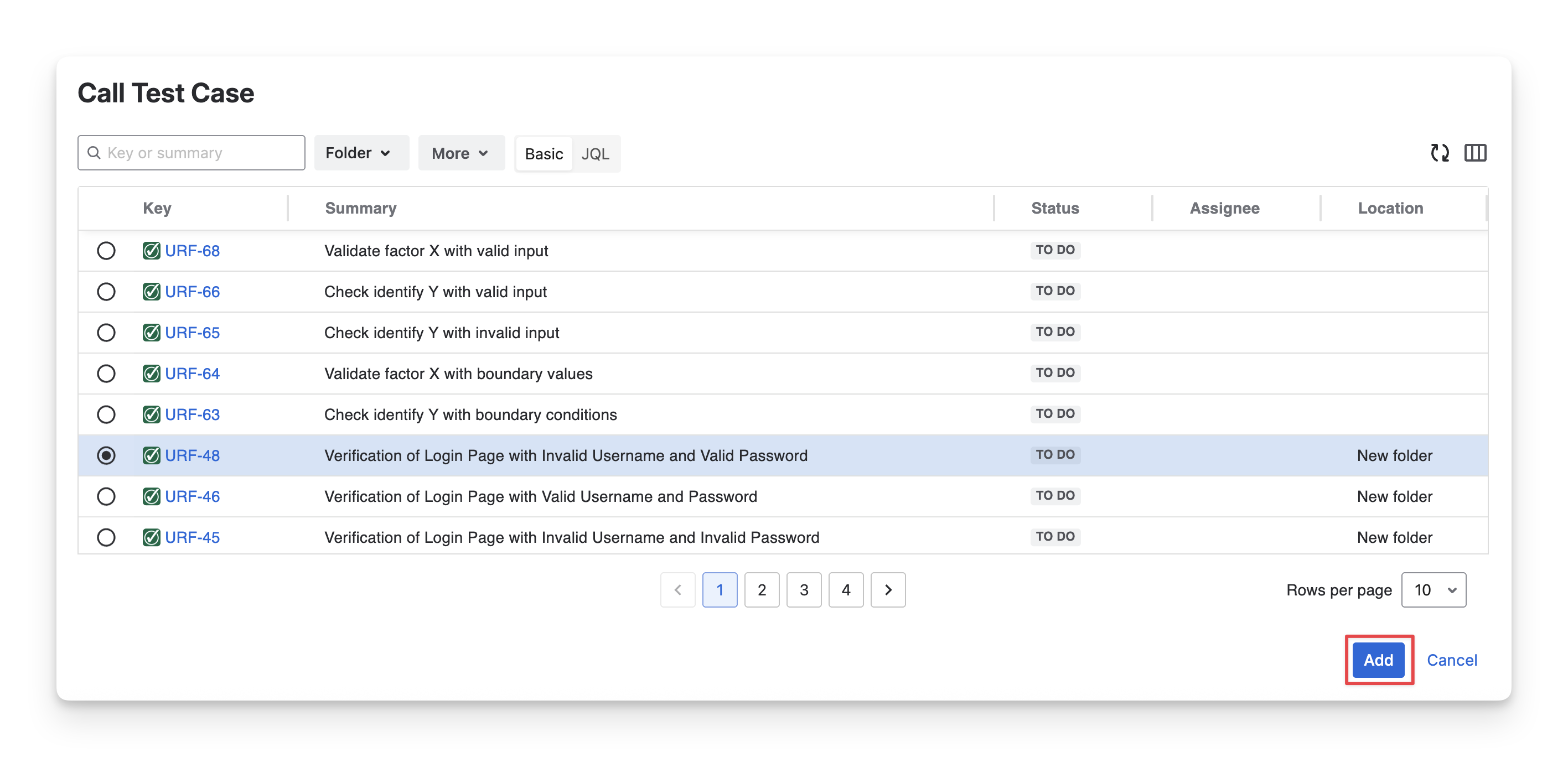 Apply filters to select a test case to “Call test”. Click Add to complete this process.
