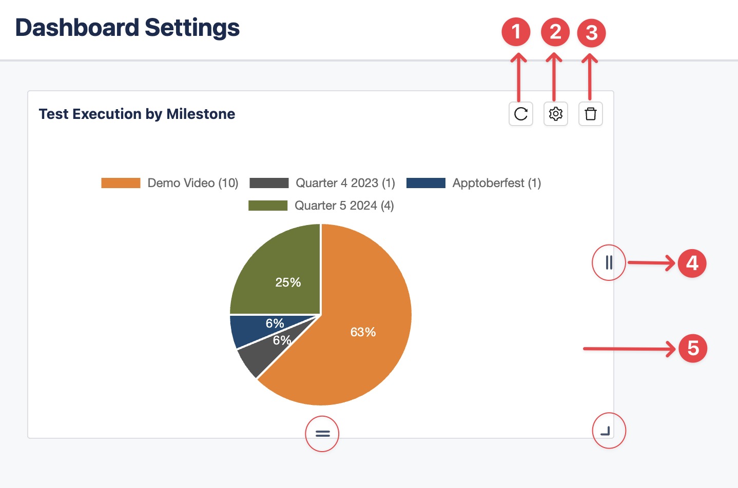 This widget displays a pie chart that illustrates the distribution of test executions across various milestones. Milestones or sub-milestones will not display a percentage if they are not linked to any test executions.