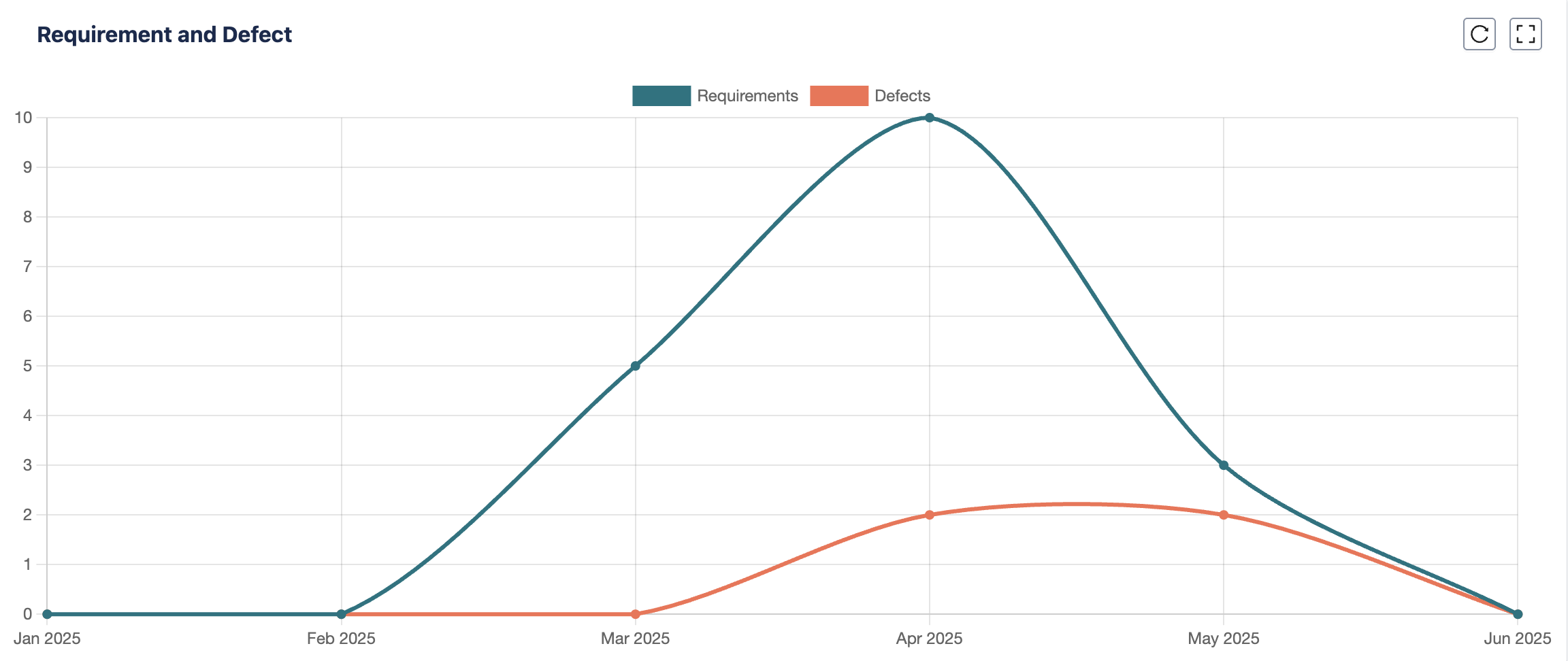 Hover over a section of the line chart to view the number of requirements or defects, and their timeline.