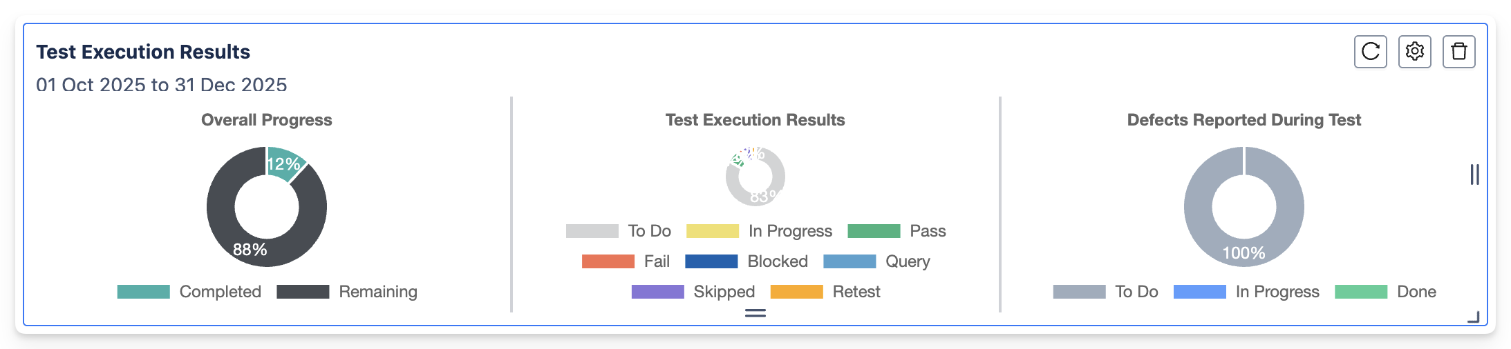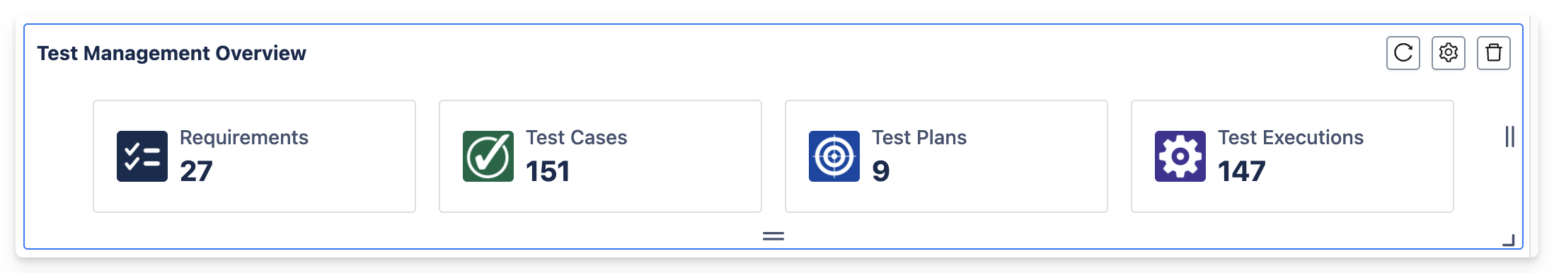This widget provides a comprehensive snapshot of the testing process by displaying key metrics: the number of Requirements, Test Cases, Test Plans, and Test Executions.