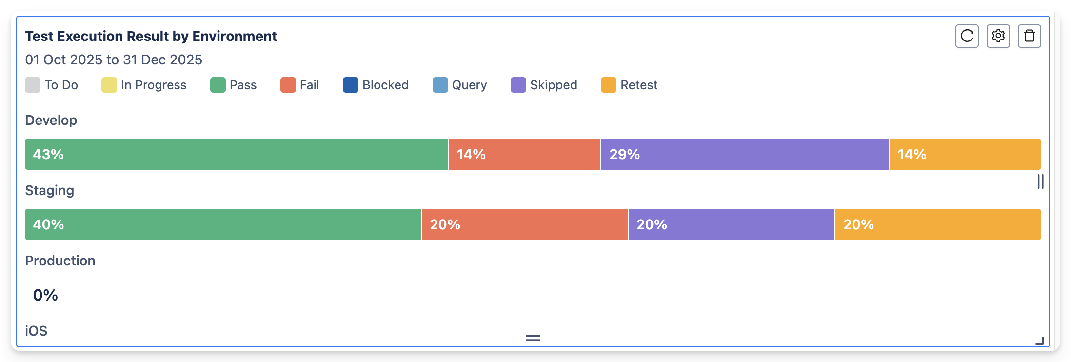This widget visualizes the distribution of test execution statuses that are assigned with Jira environments, using a stacked percentage bar chart format. The right-most percentage shows the proportion of PASS test executions associated with that environment.