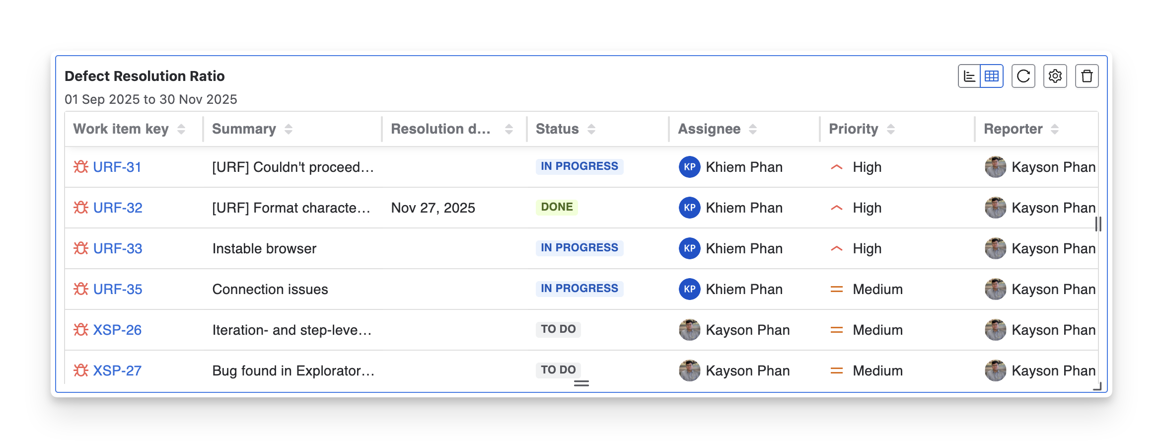 Track individual defect progress: See detailed information on defects that are still open, in progress, or resolved.