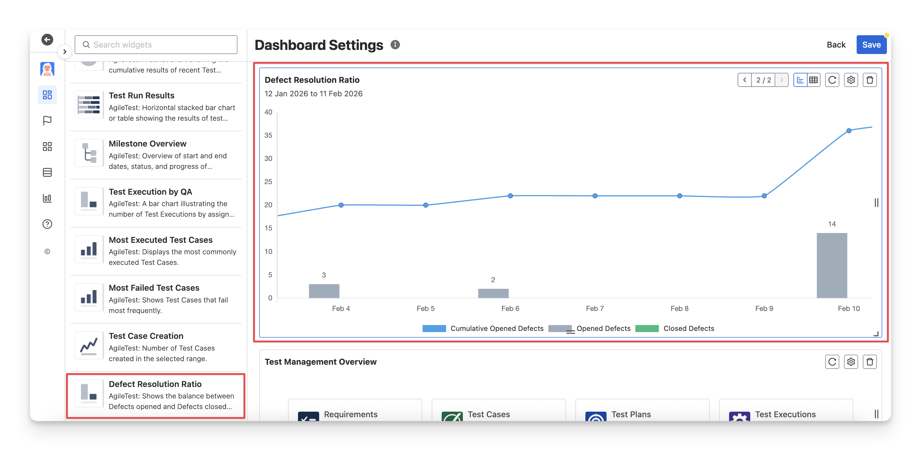 The Defect Resolution Ratio widget provides an overview of defect resolution progress by tracking all defects in your instance, including both defects linked and unlinked defects that match the configured defect mapping. It helps teams understand how many defects are being opened versus resolved over time, offering clear insight into overall product stability and testing health.