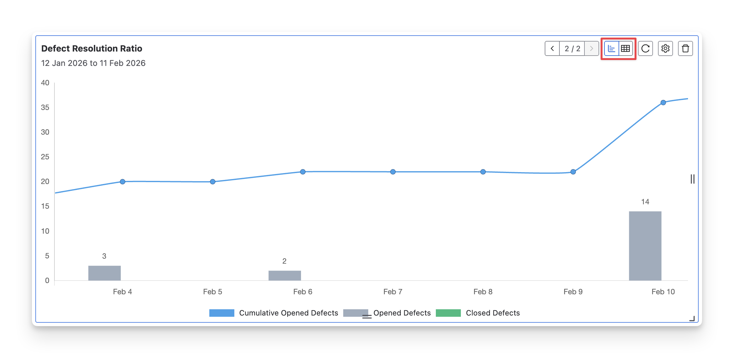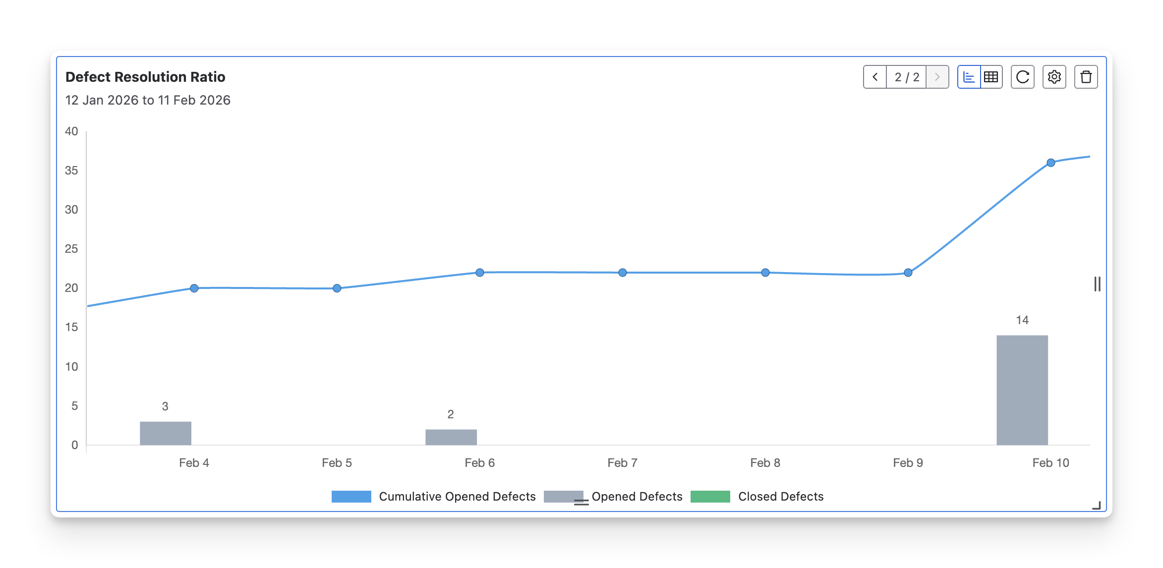 The Defect Resolution Ratio chart visualizes how defects are opened and resolved over time. It typically shows newly opened defects, closed defects, and the cumulative number of open defects within the selected period.