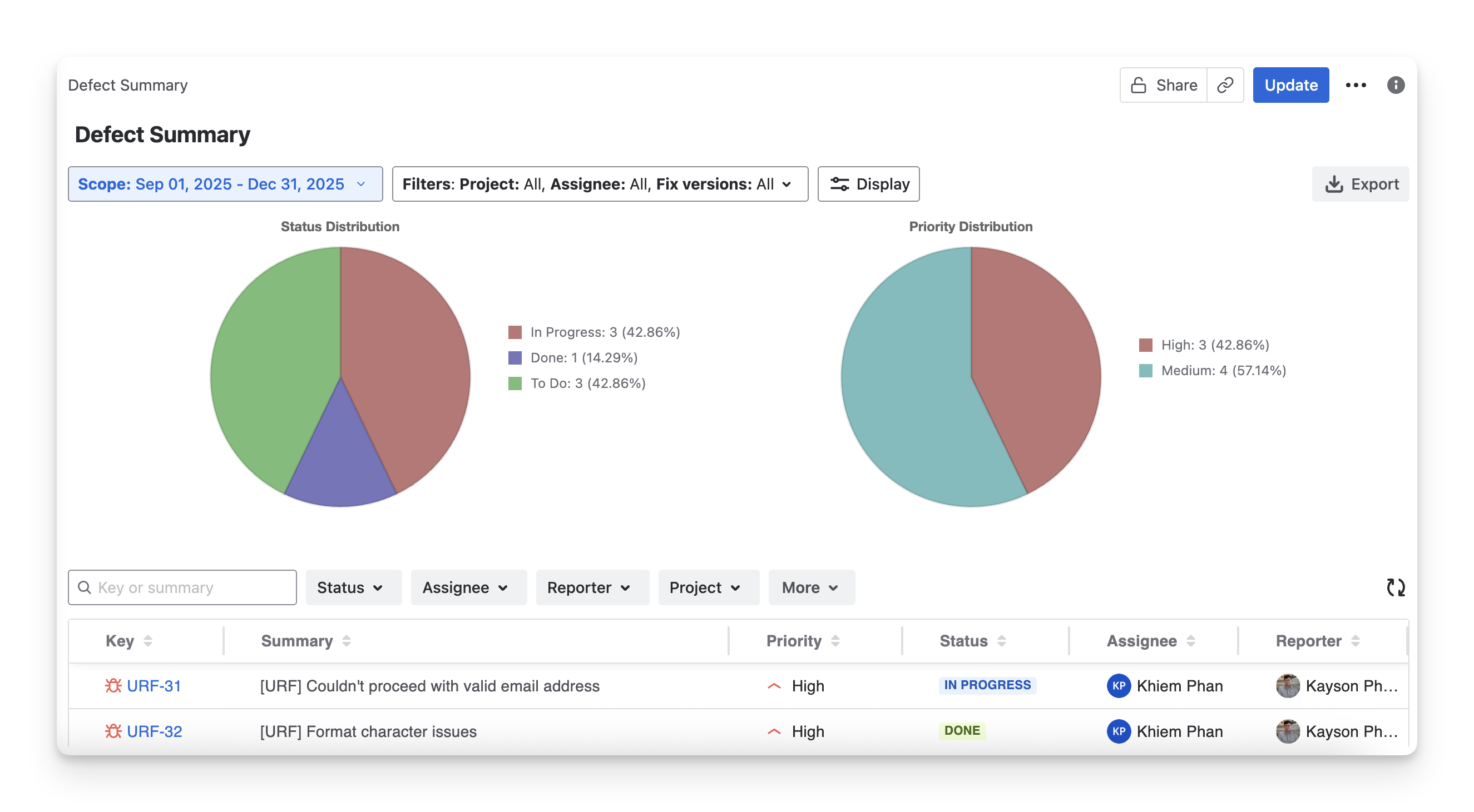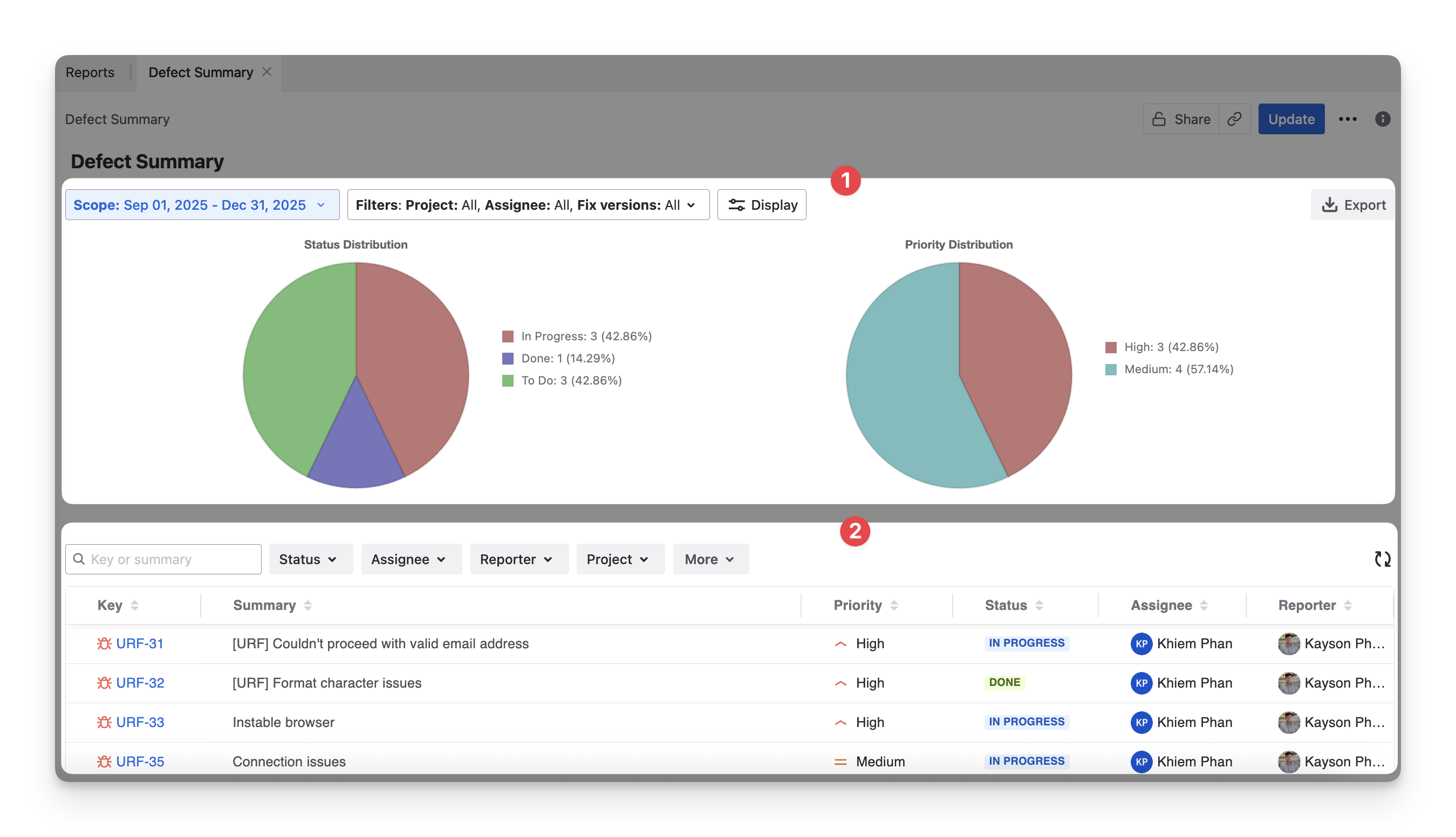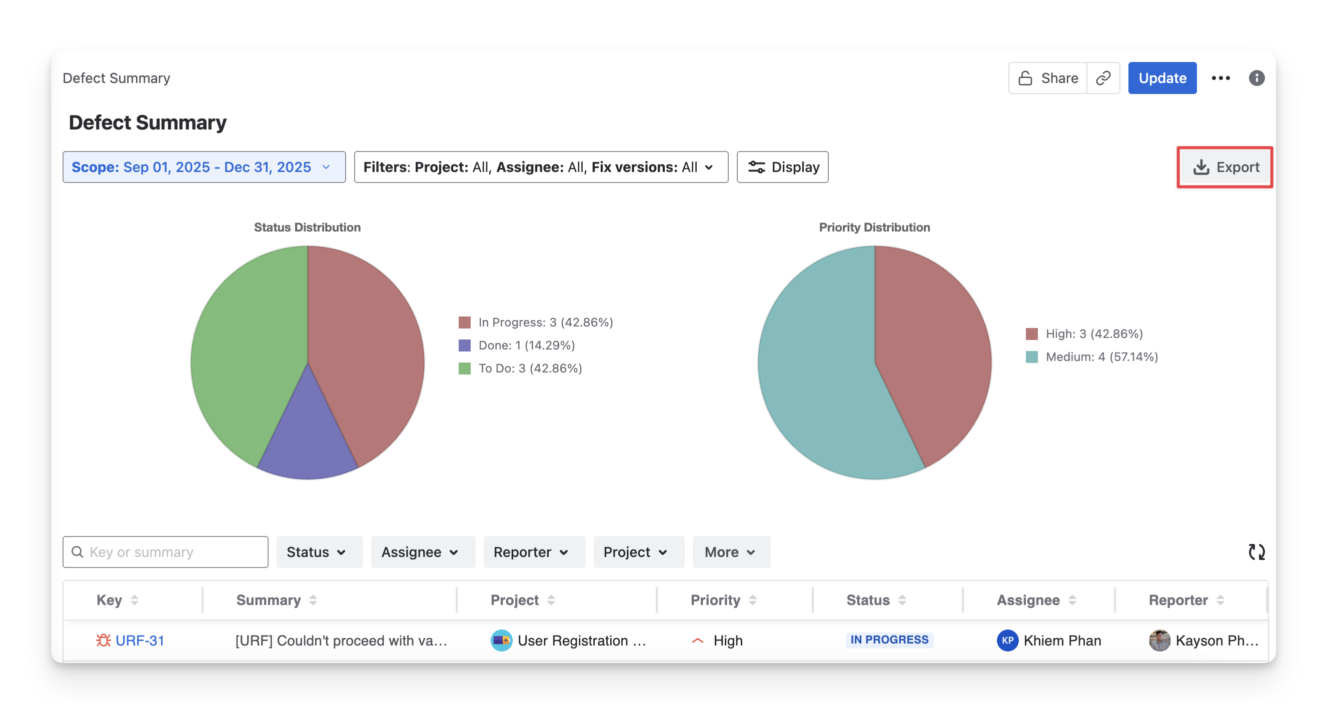 Assignee distribution | Breaks down defects by assigned team members. This helps you understand workload and spot bottlenecks. |