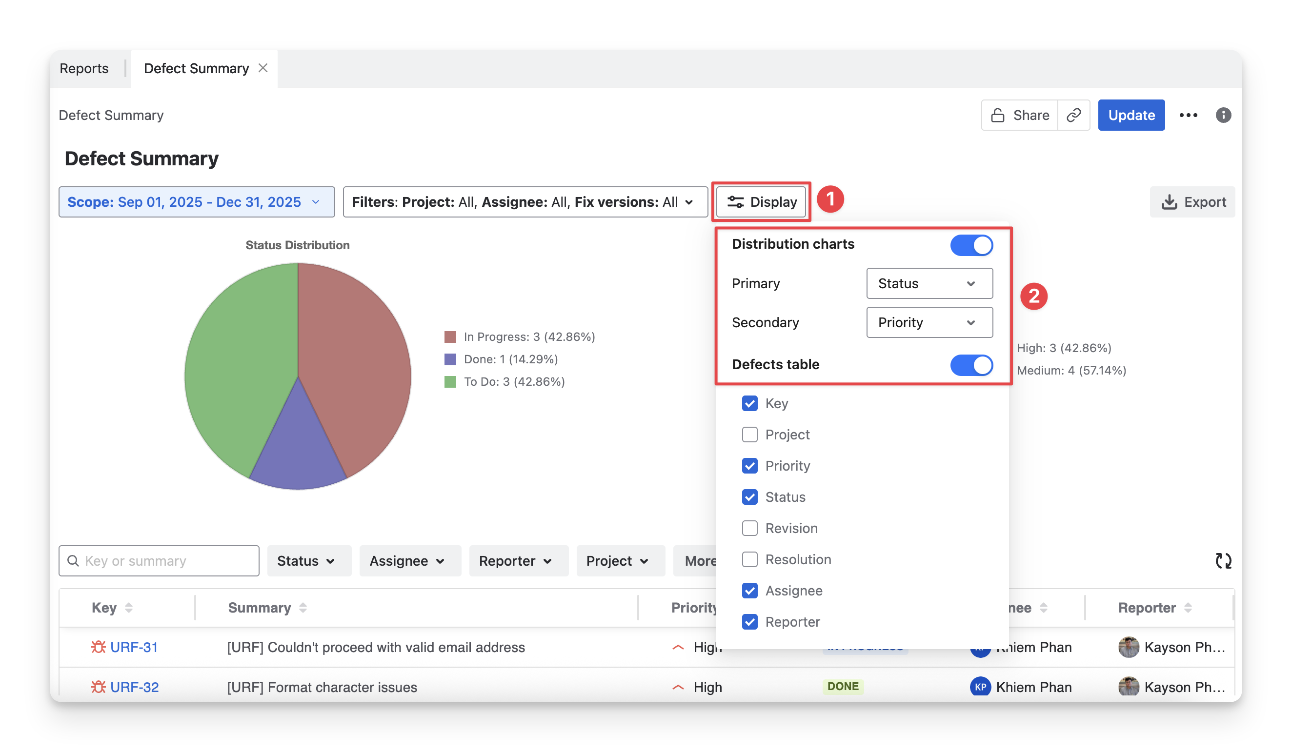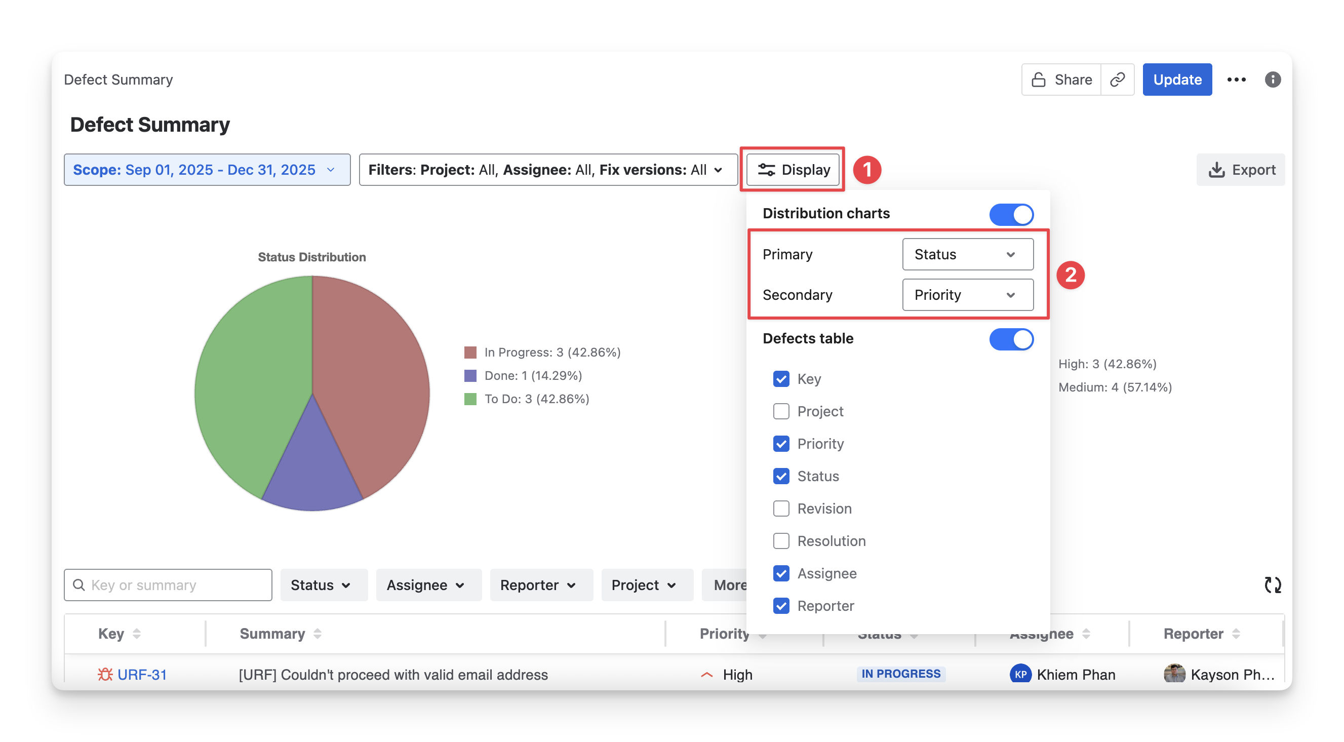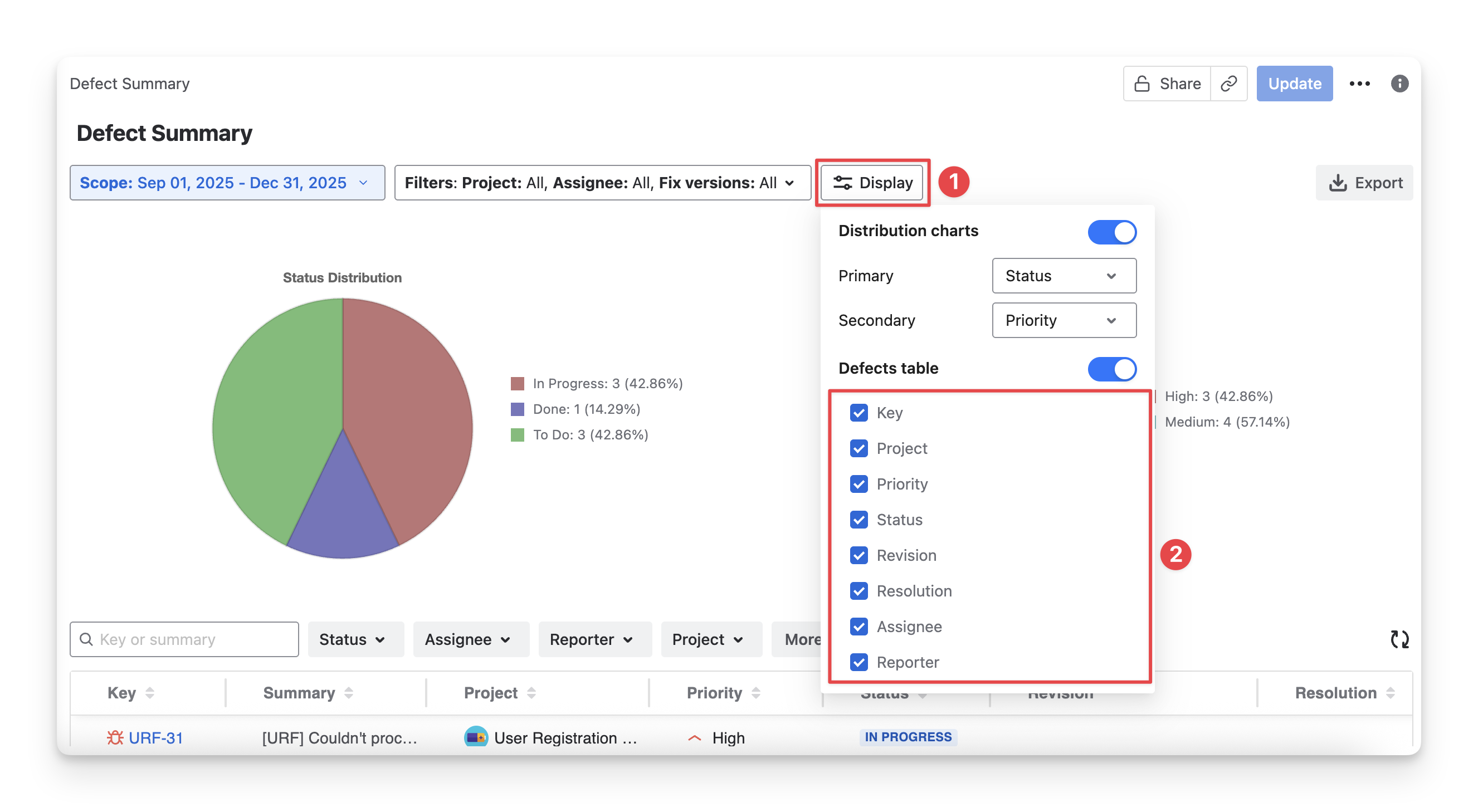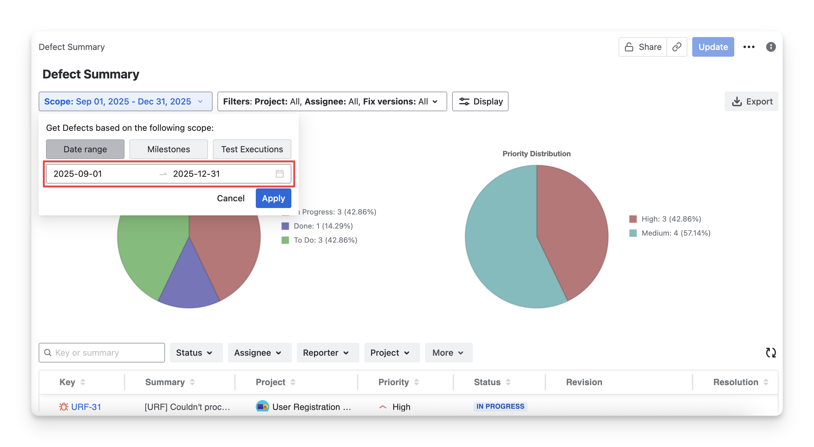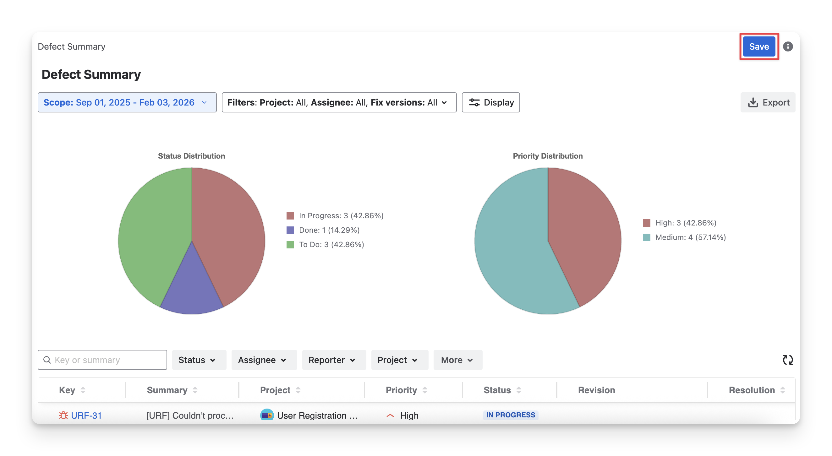 Defect Distribution Chart: A visual overview showing how defects are distributed by status, severity, or priority, helping you quickly identify problem areas and trends.
