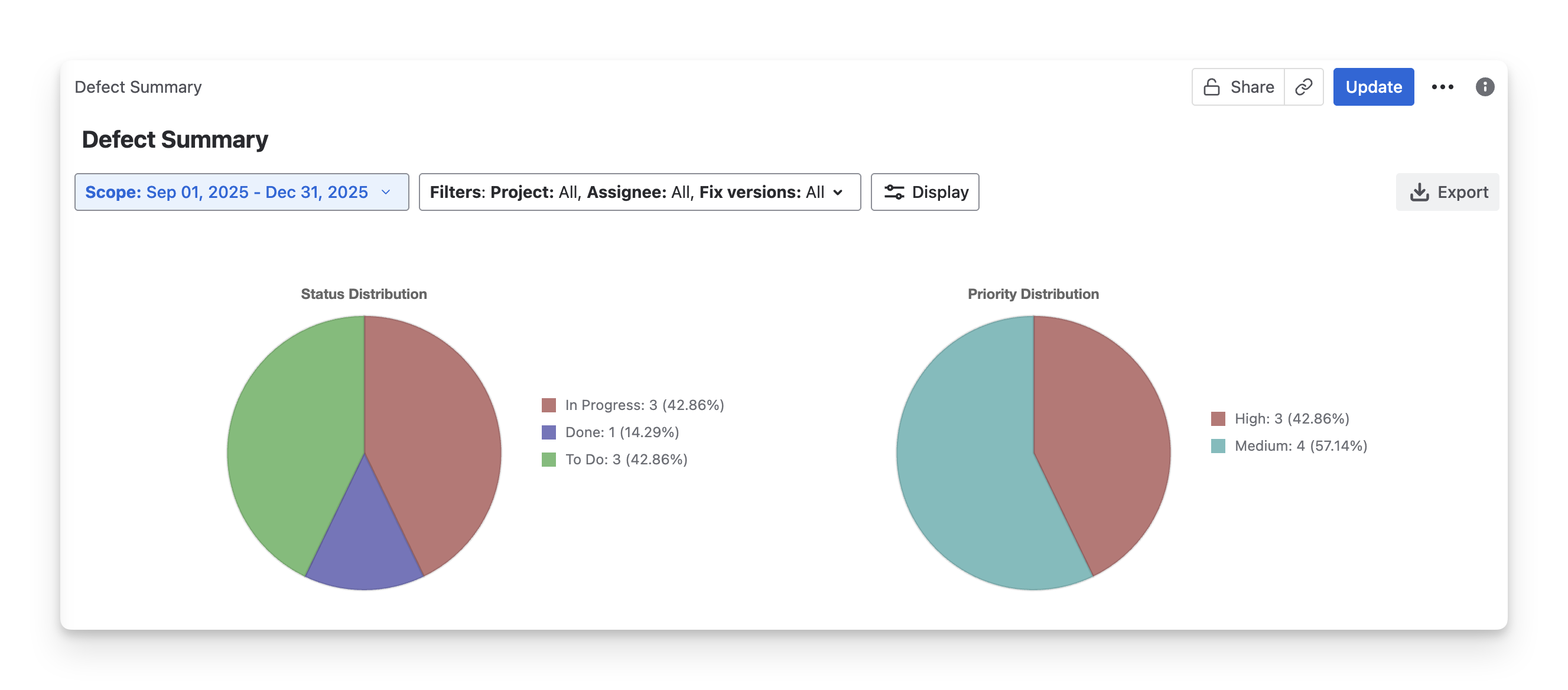 Status distribution | Shows defects across statuses (e.g., Open, In Progress, Resolved, Closed). This helps you see overall progress and remaining defects. |