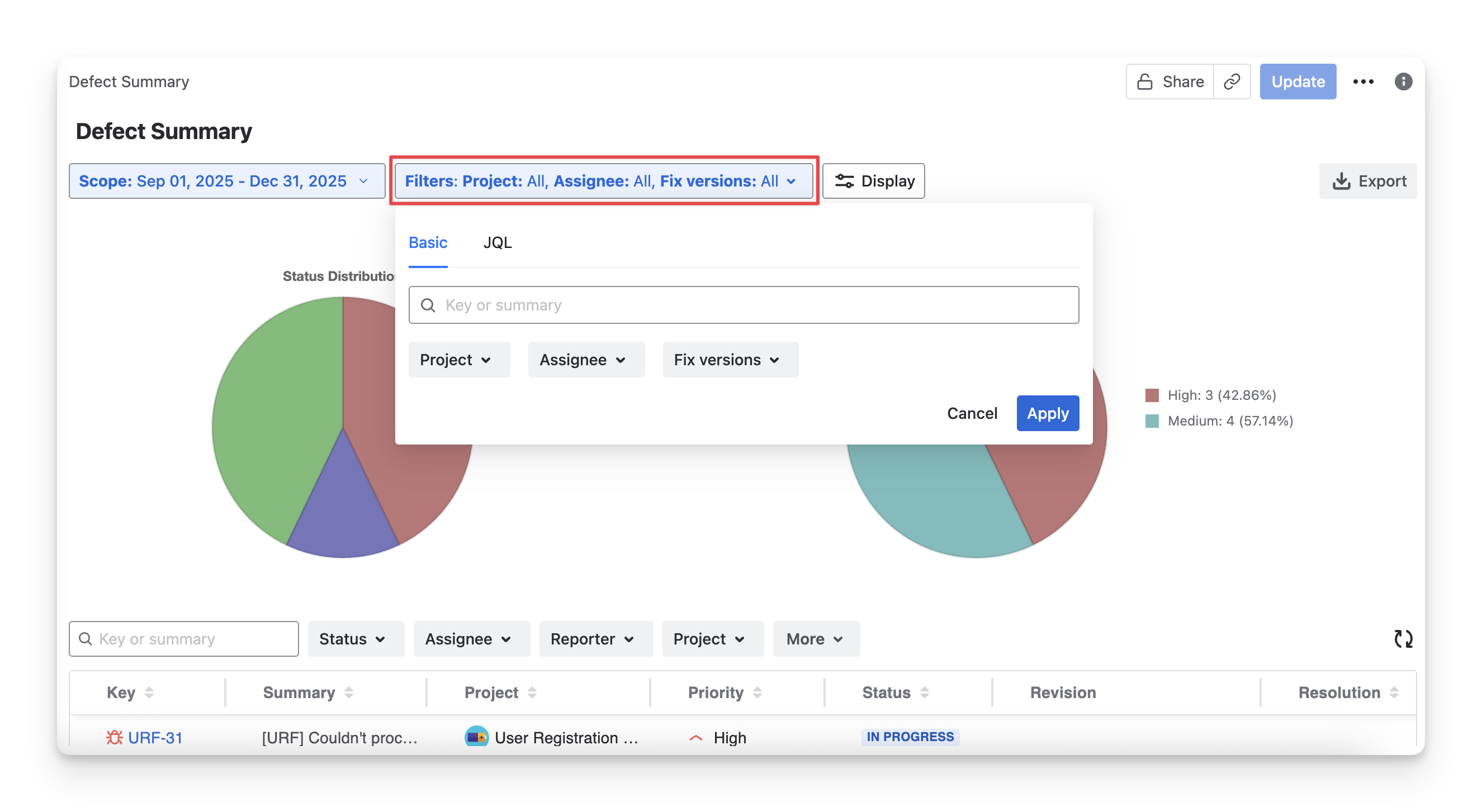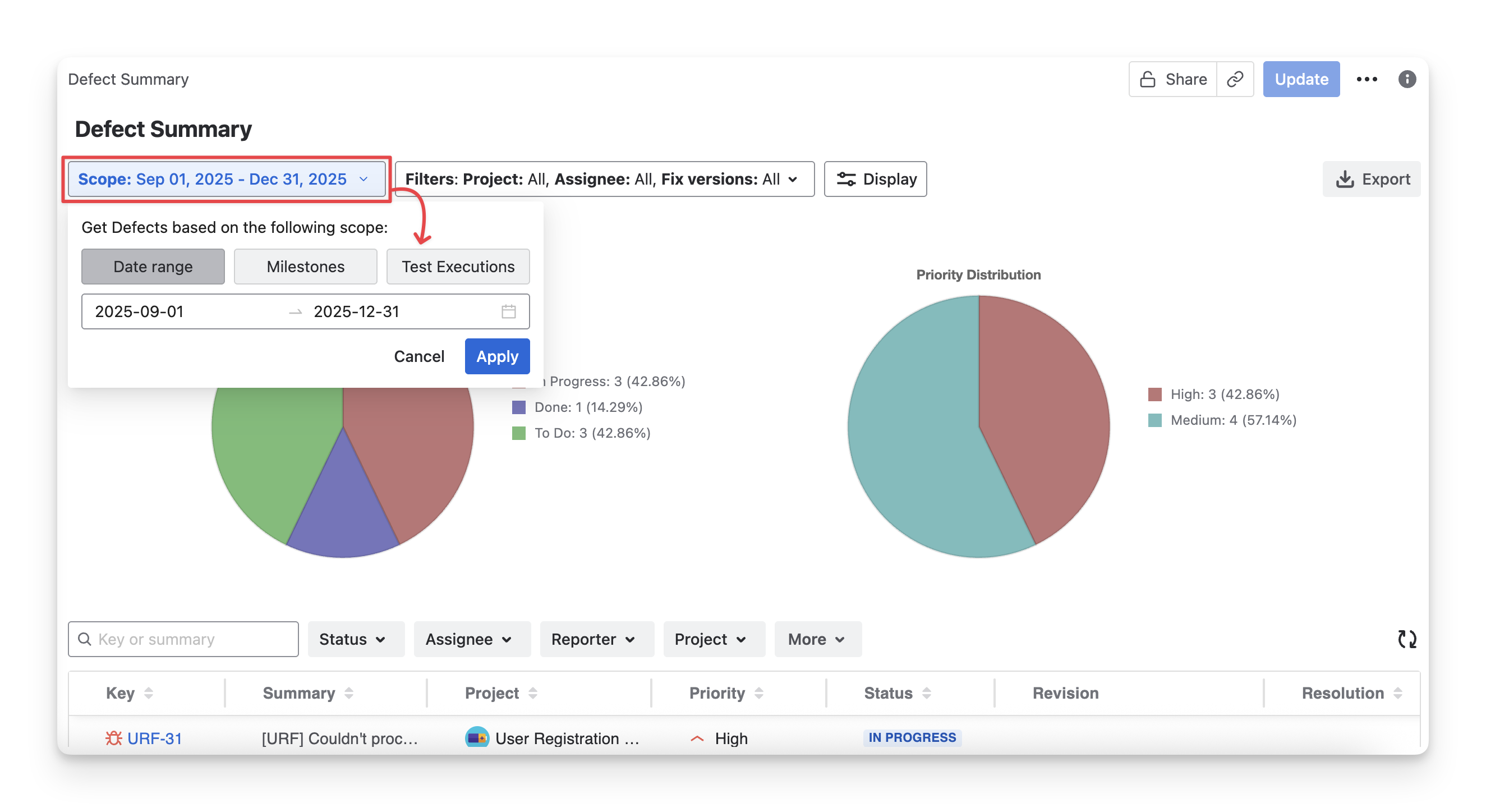 Manage the data scope using Analysis & Scope to control which defects are included in the report.