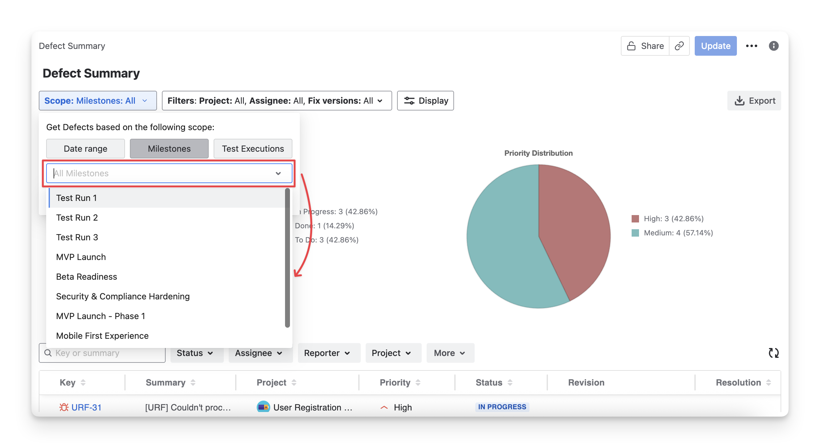 Milestones: select your created Milestone. The report will gather all defects found in this milestone