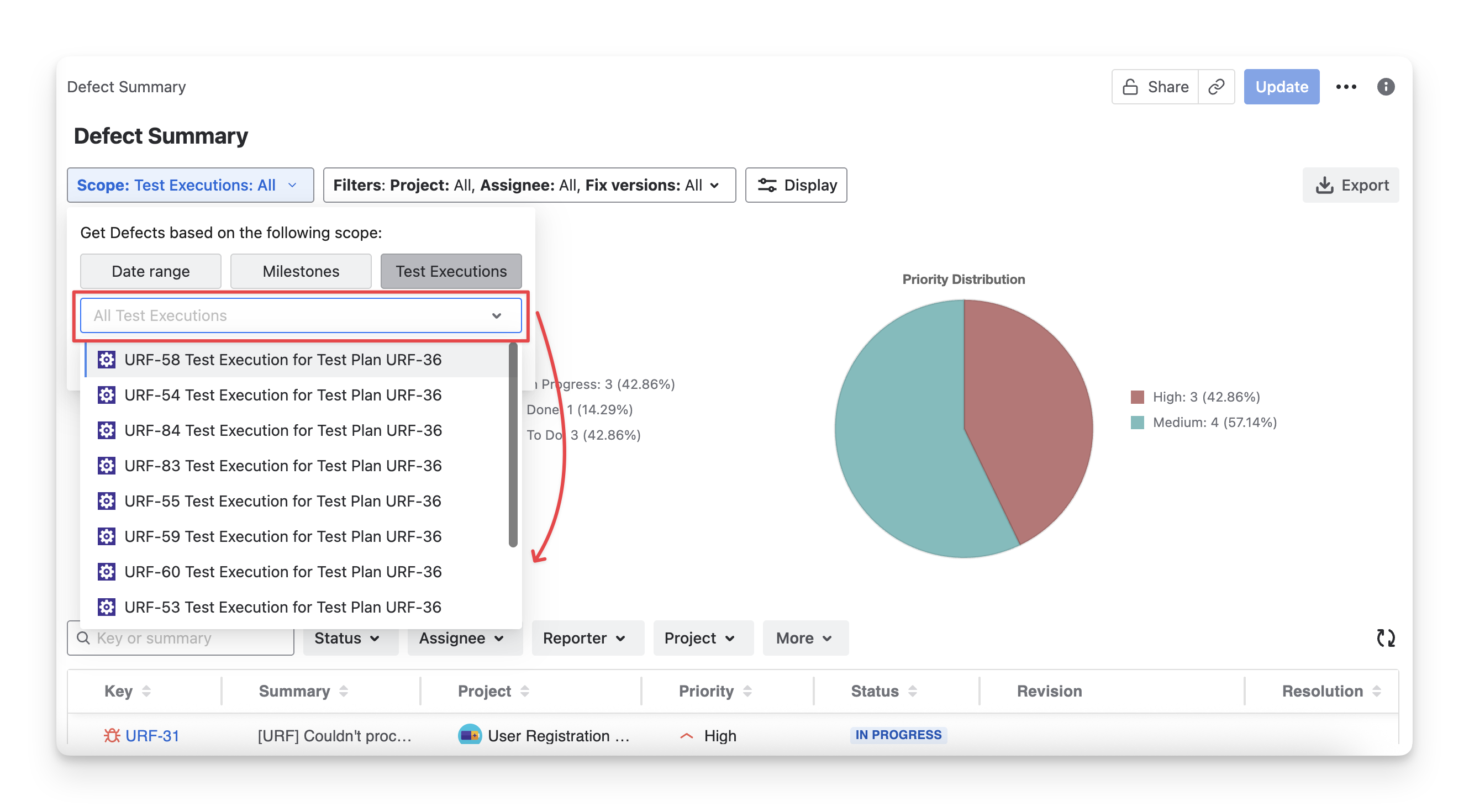 Test Executions: select some specific test executions. The report will show all defects for those execution sessions.