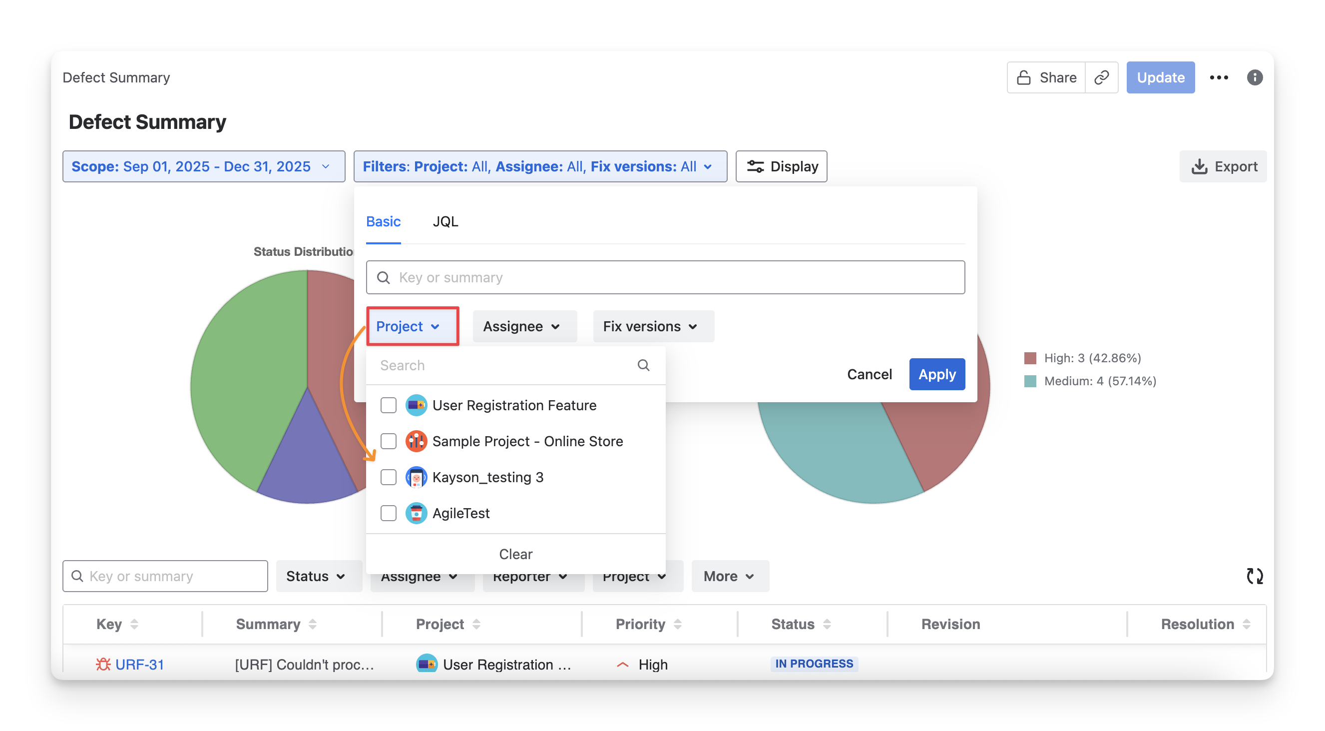 Project distribution | Shows which projects or modules defects belong to. Useful for spotting areas with more defects. |