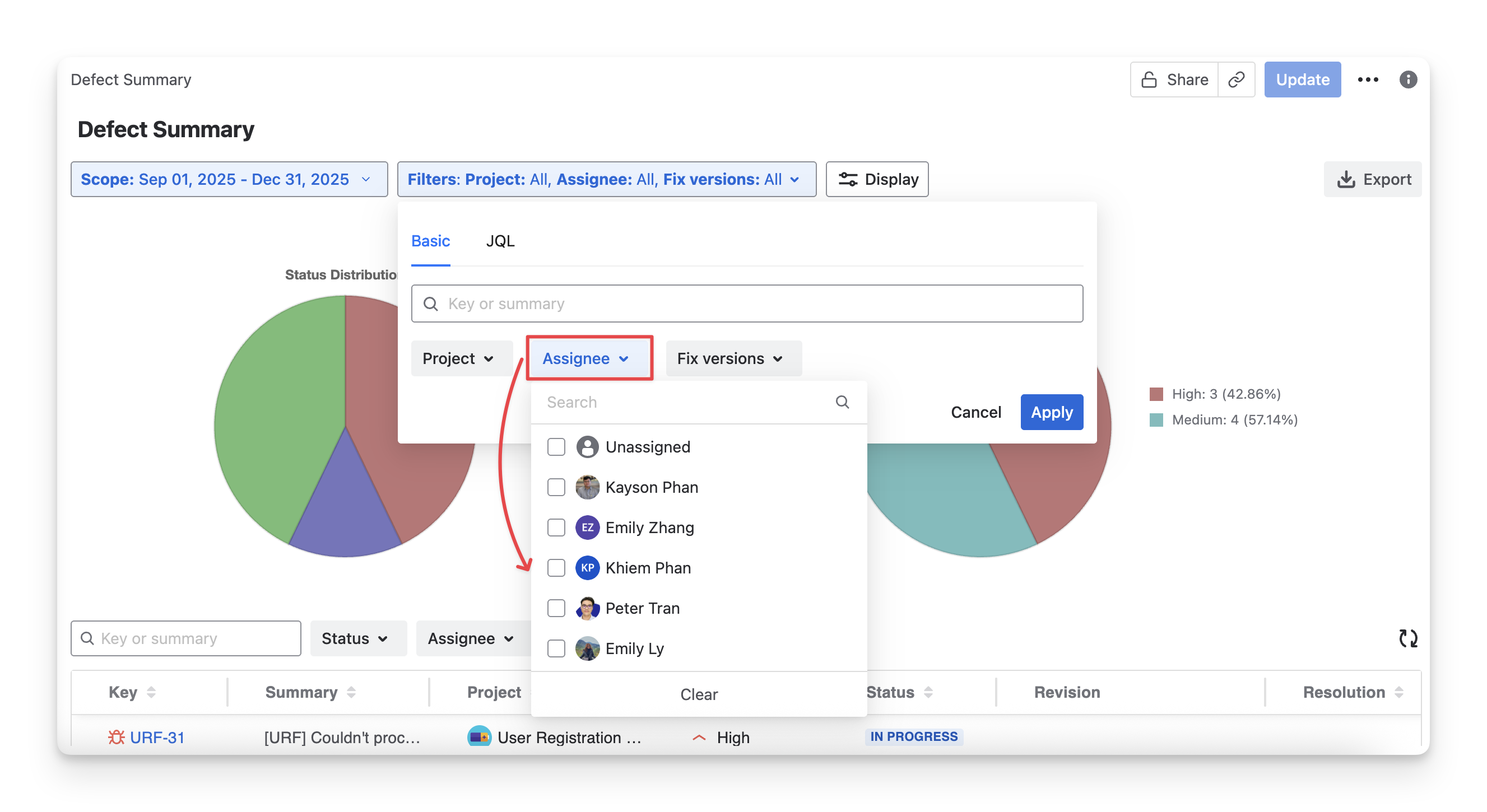 Assignee: Filter defects based on the assignee.