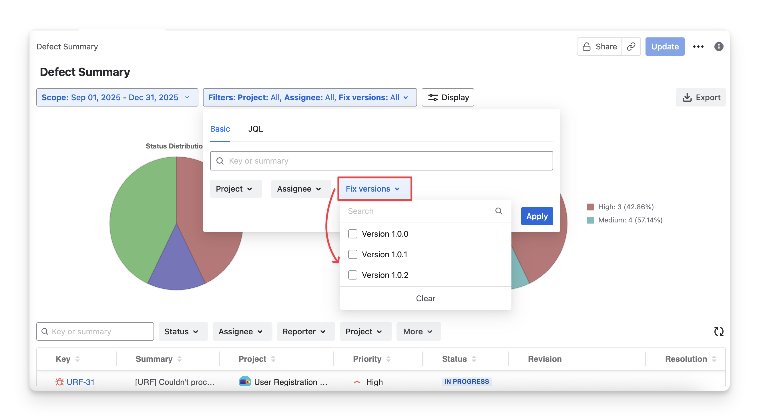 Fix versions: Filter defects with those associated with specific Jira fix versions.