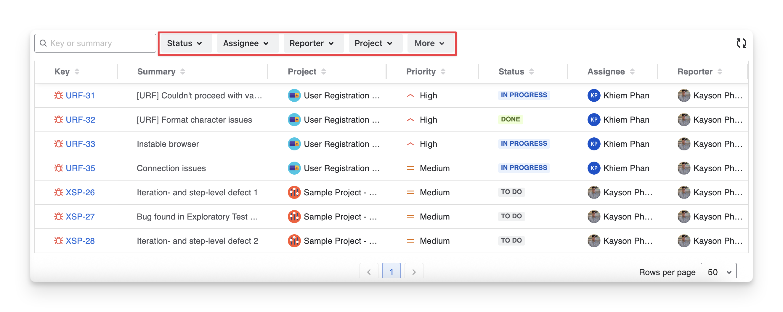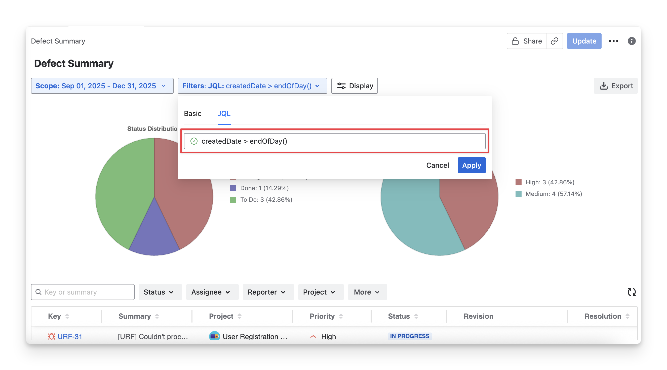 Status: Filter defects based on their Jira status (TODO IN PROGRESS DONE)