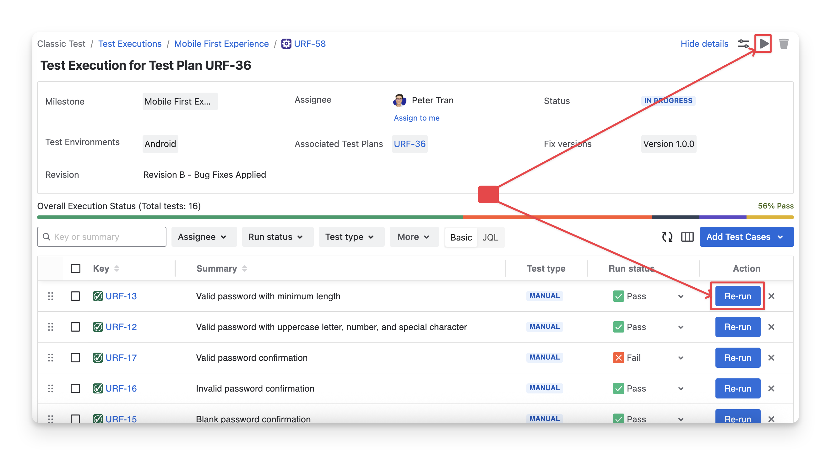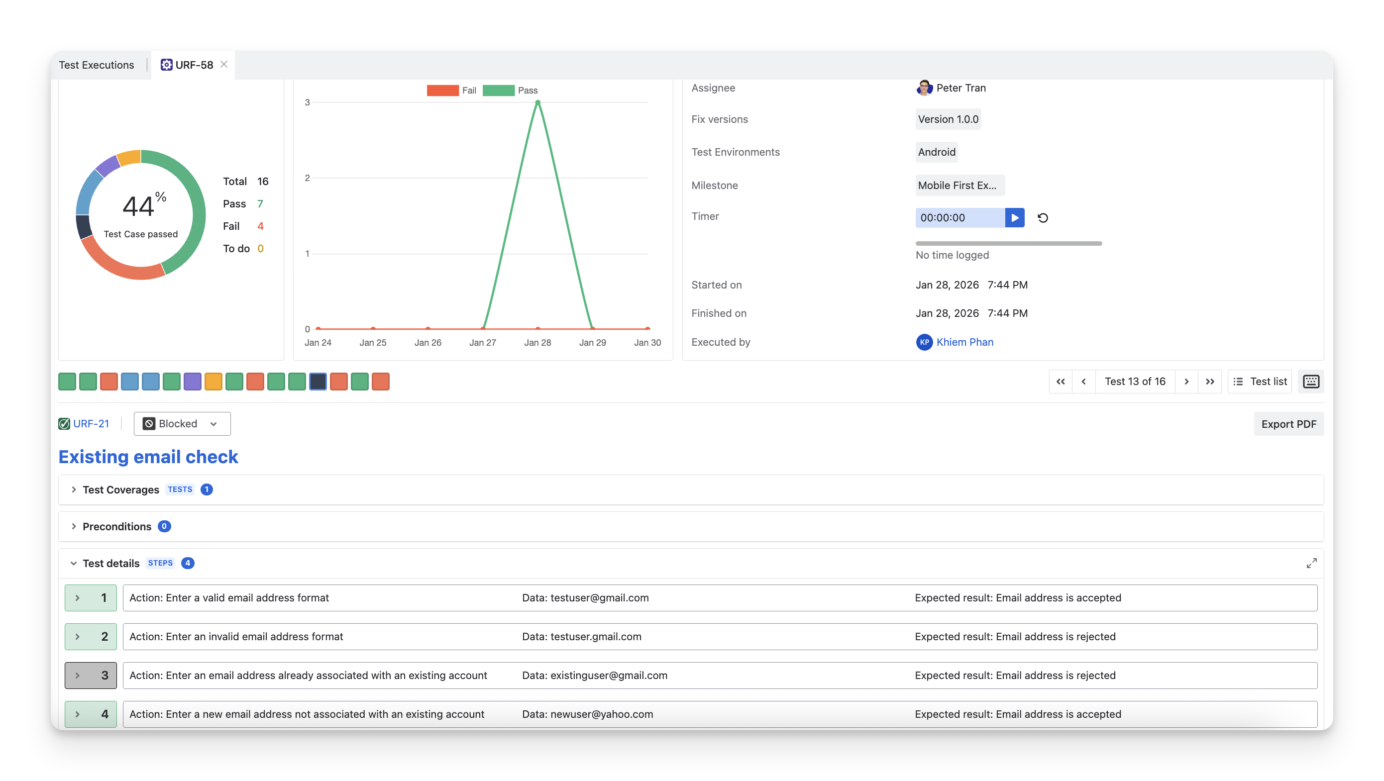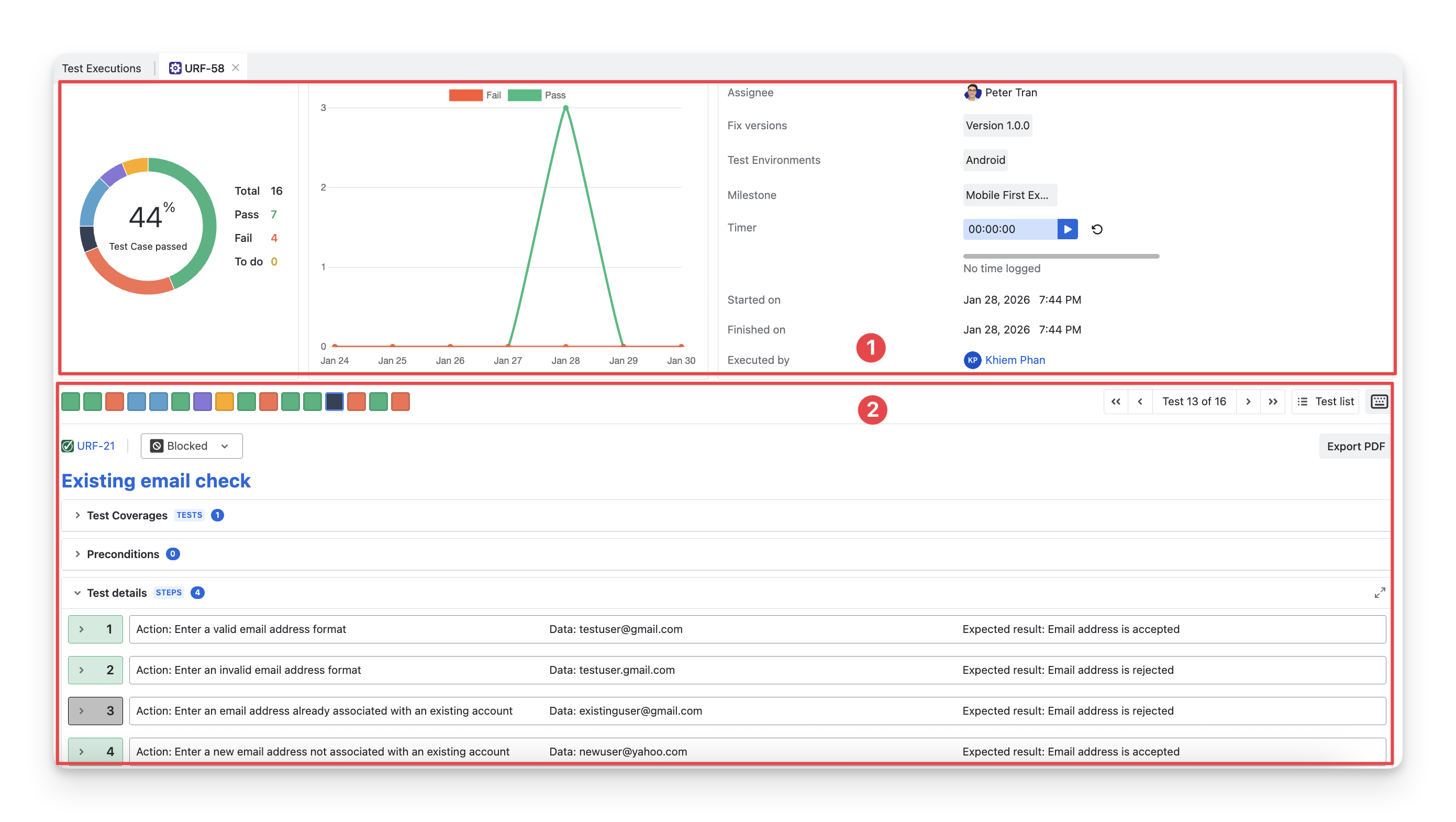 Test Execution Space: This section is where you perform the execution of test cases, track individual test step statuses, and log findings.