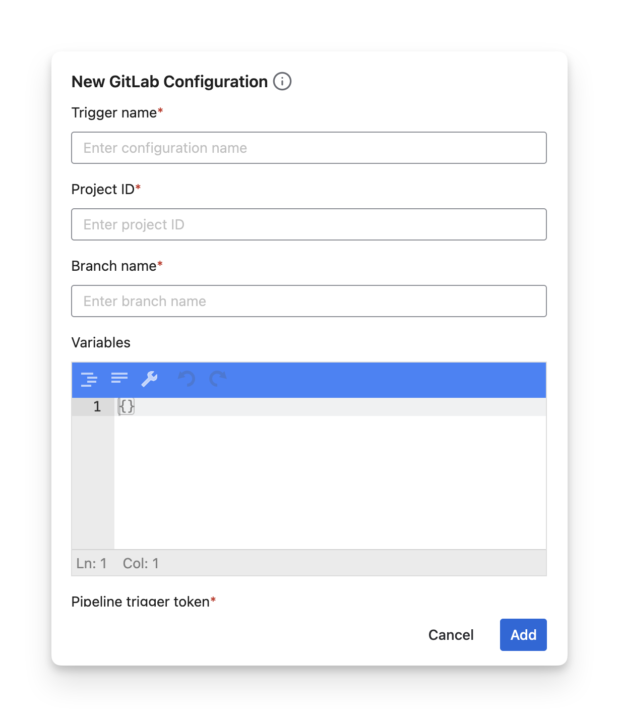 Variables: This field allows the user to add any custom variables to send along with the triggering request. In most cases, you would not need it. However, in some special cases, it may provide a way to collaborate with further setups in your GitLab pipeline.