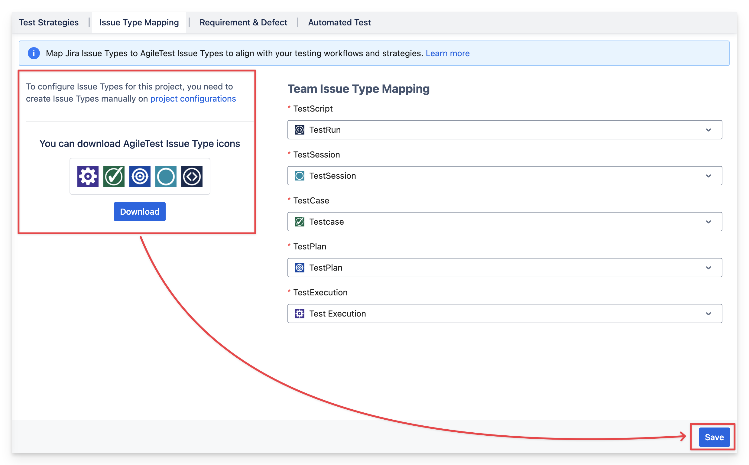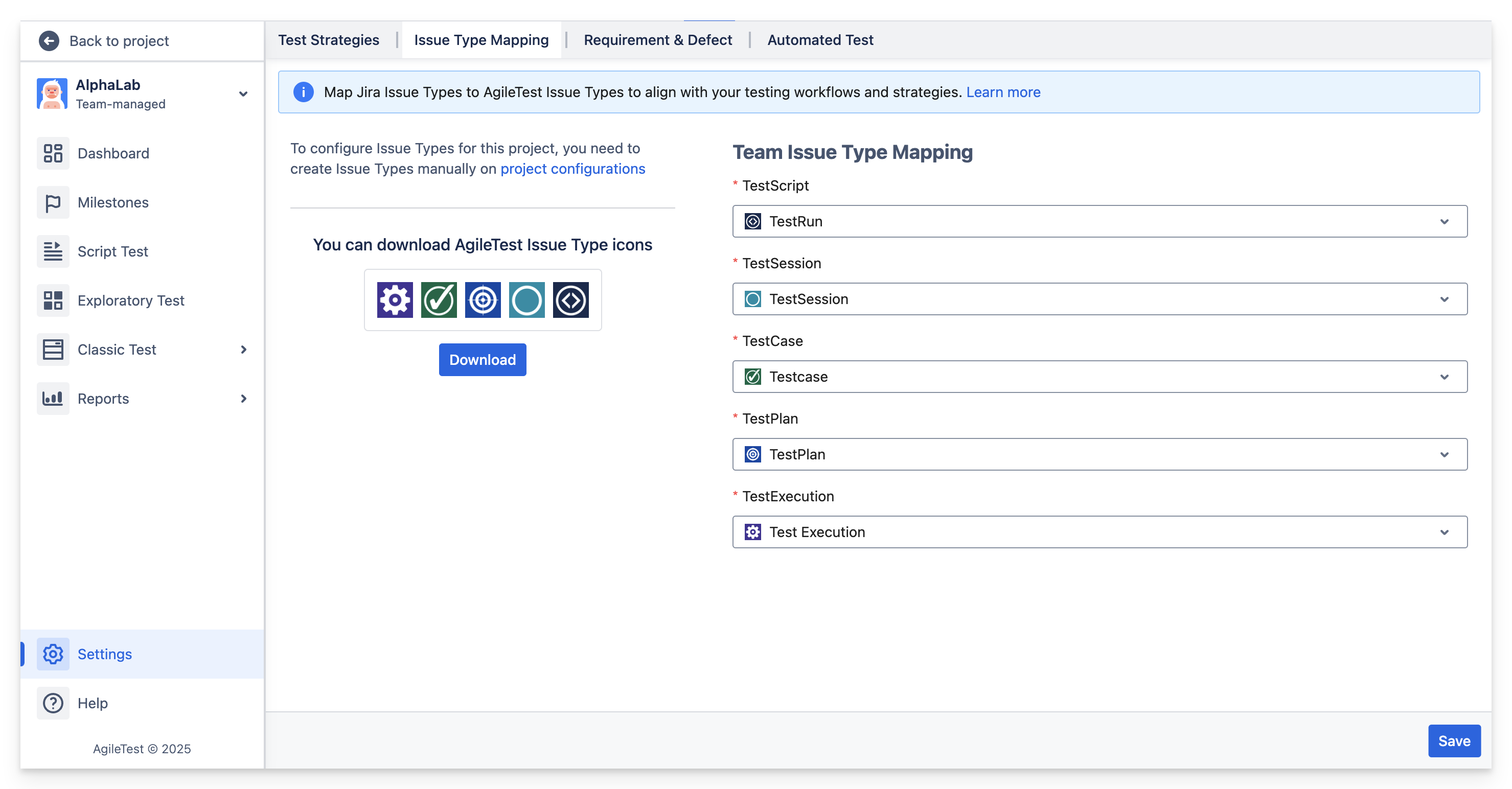 If the AgileTest is not yet present in the project, choose Issue Types Mapping in AgileTest Settings.