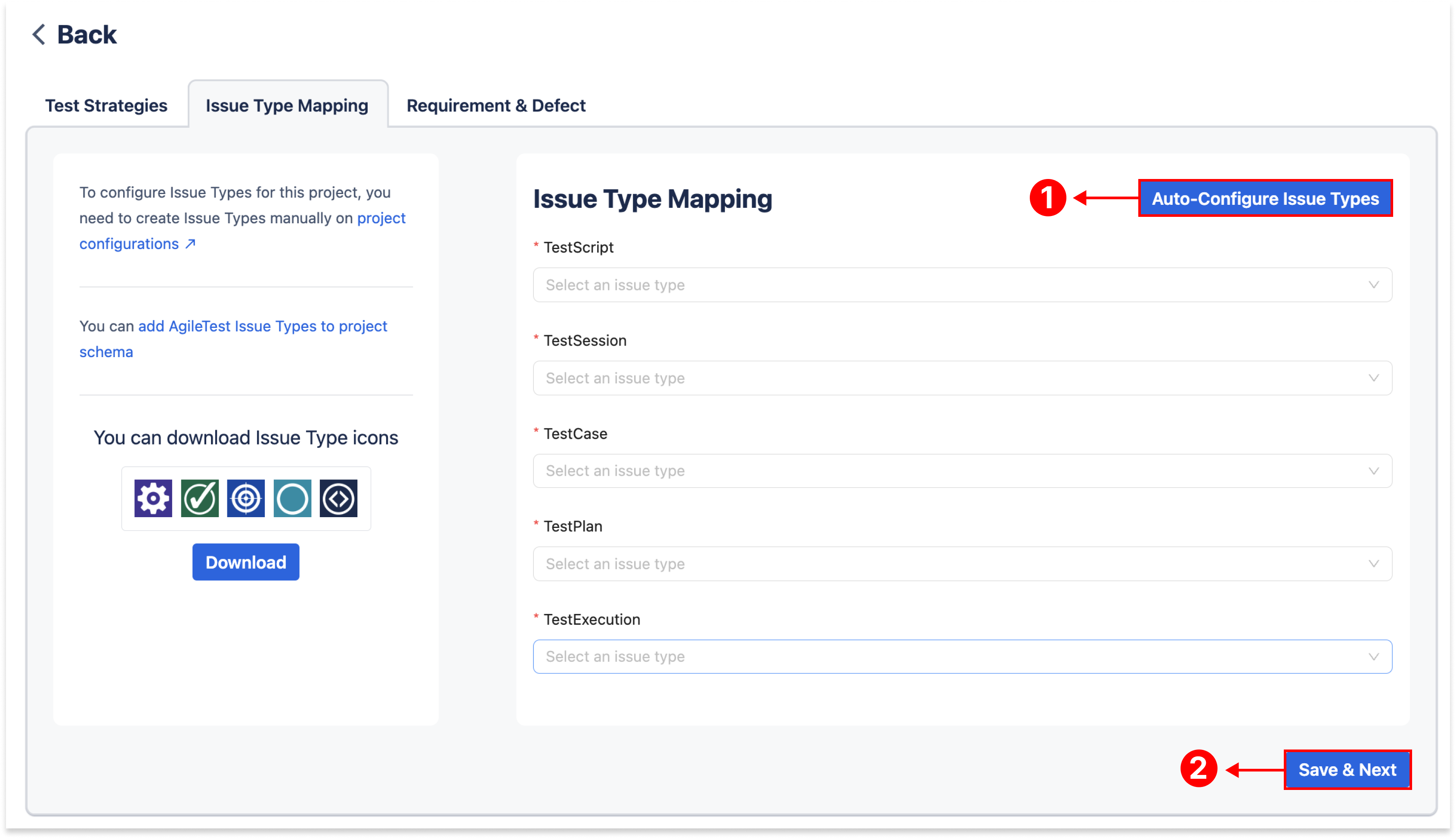 Manual configuration: For users who want to define and map Issue Types themselves, this approach requires more time and effort but offers greater flexibility to align AgileTest with their existing workflow.