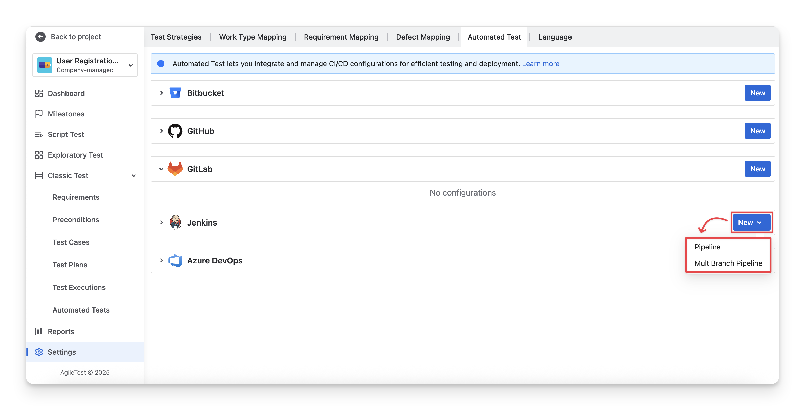 In Agile Test, we support 2 types of Jenkins jobs: Pipeline and MultiBranch. You are required to fill in the details as follows.