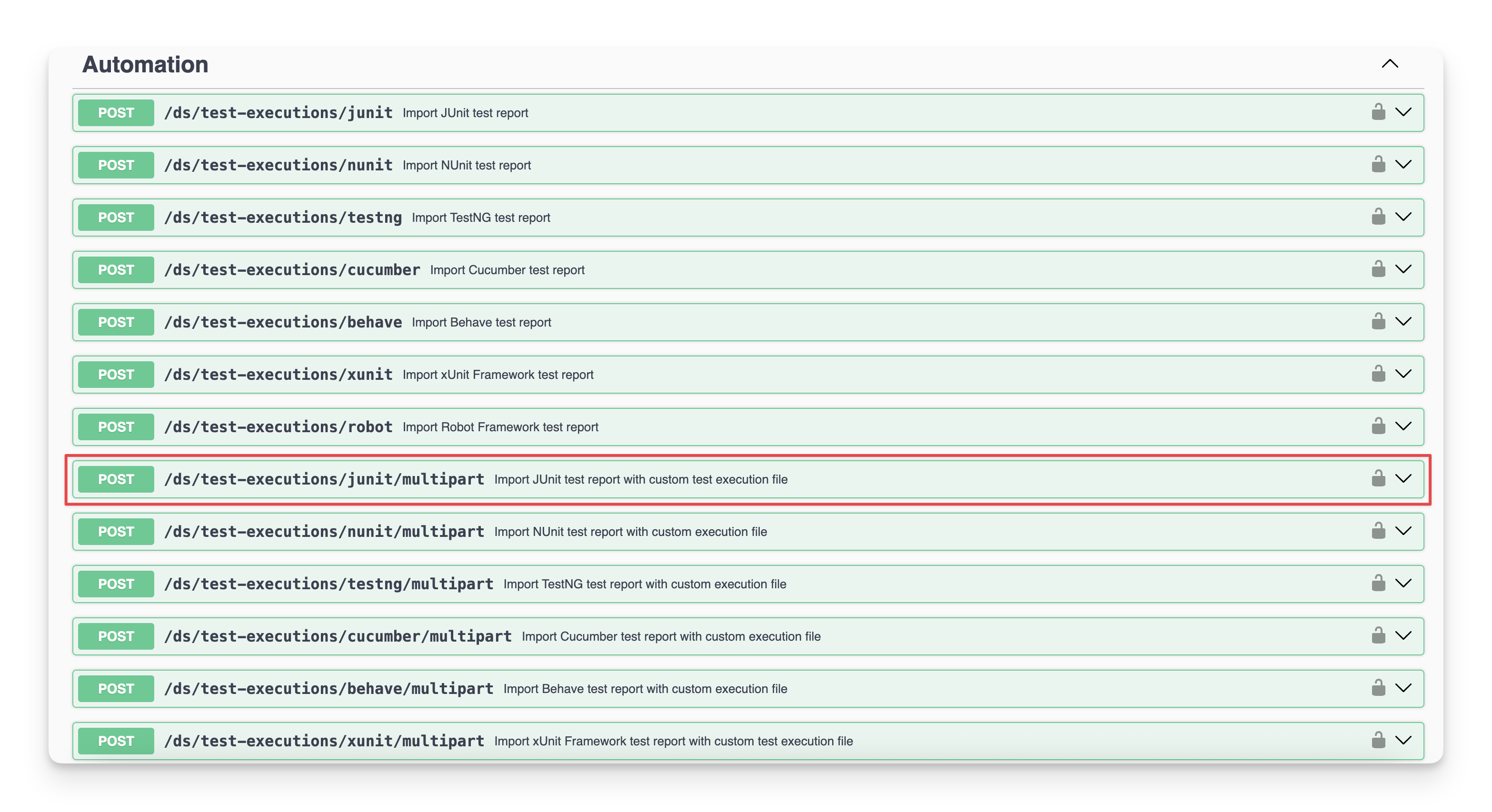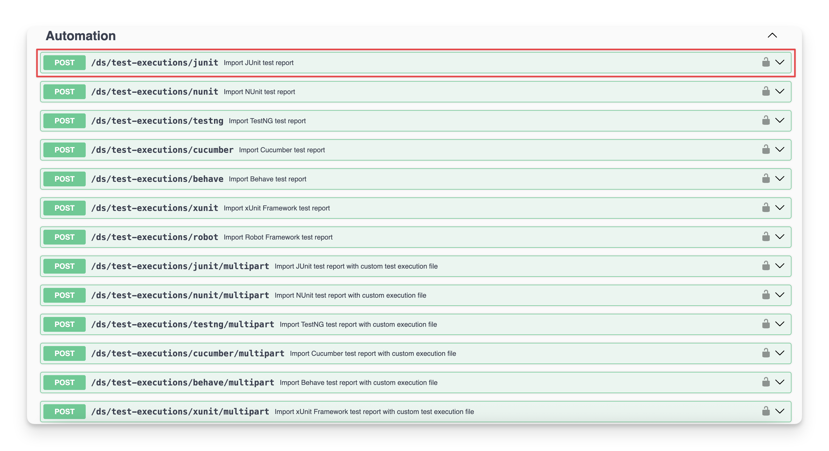 You can locate the endpoint at the POST/ds/test-executions/junit in the API document.