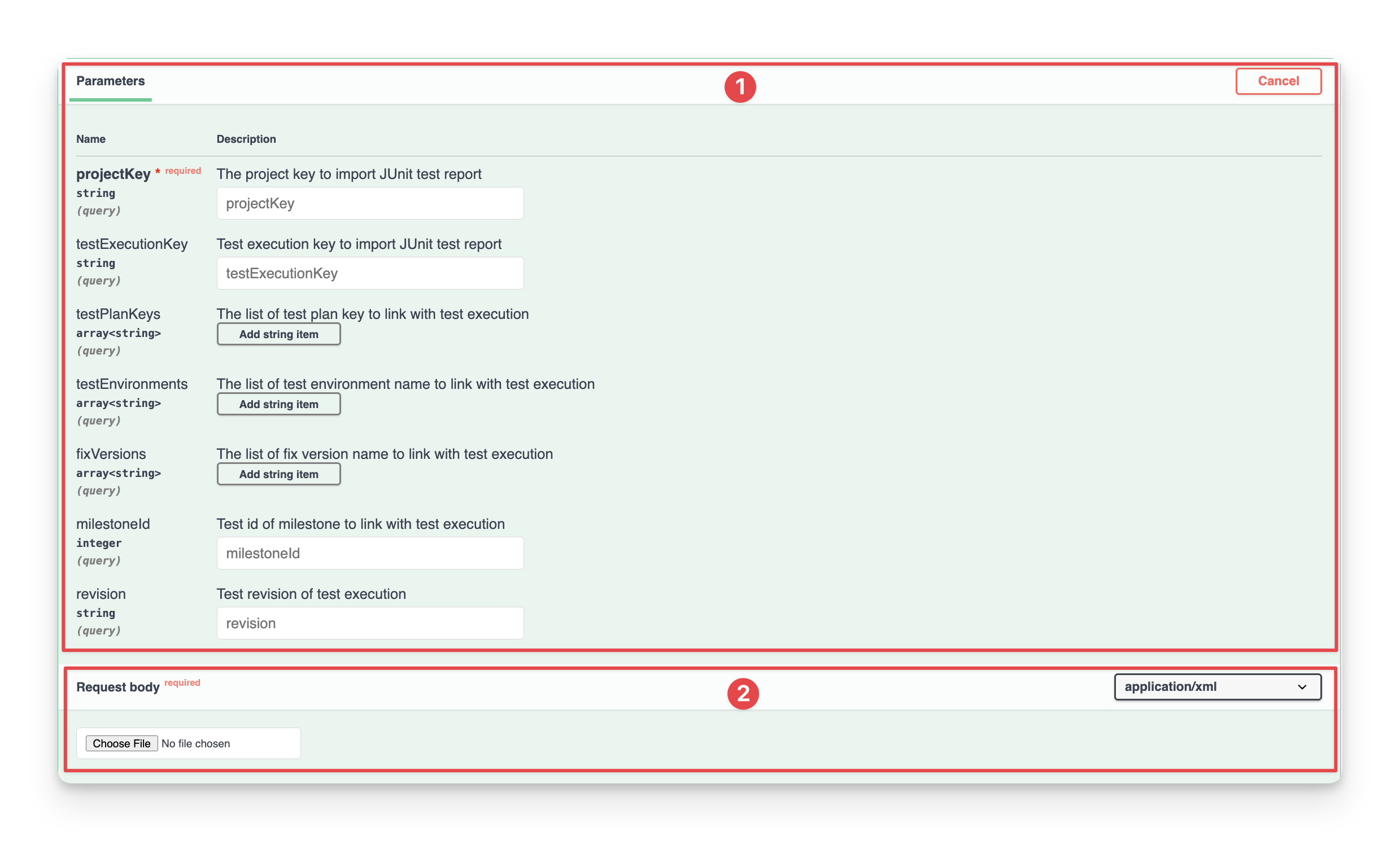Request body: where you can input an XML file, which is a JUnit report that is going to be imported.